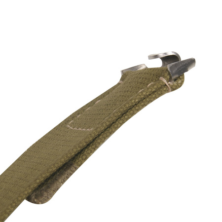 Museum-quality reproduction of German tropical belt. Made of 4,5 cm wide cotton strap with 3,5 cm wide regulation leather strap. Technology and all dimension are exact as in original belts. The tongue for regulation is made of natural leather, a steel hook is sewn in for webbing belts. Colour will fade off during usage. Highly recommended - made by Nestof®!