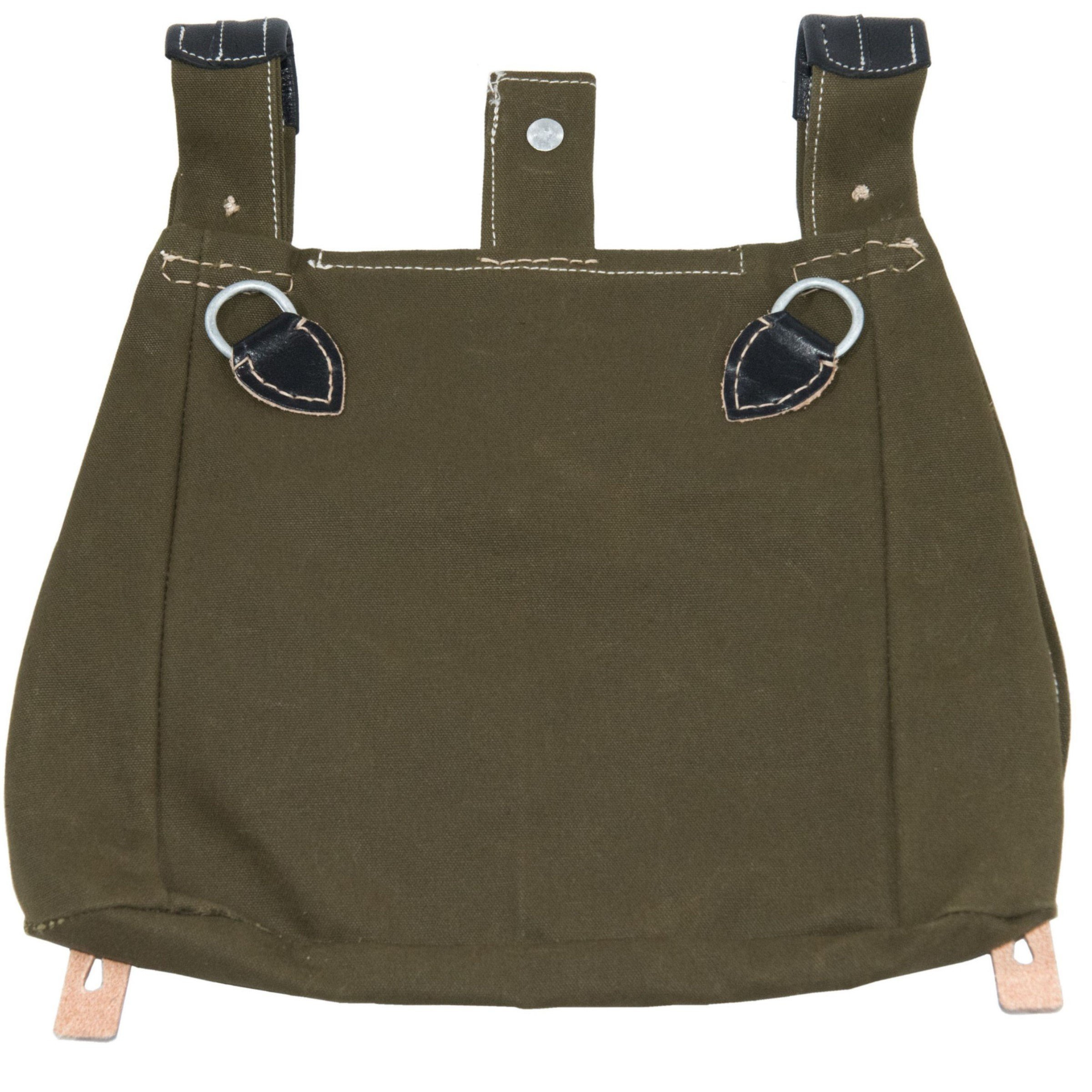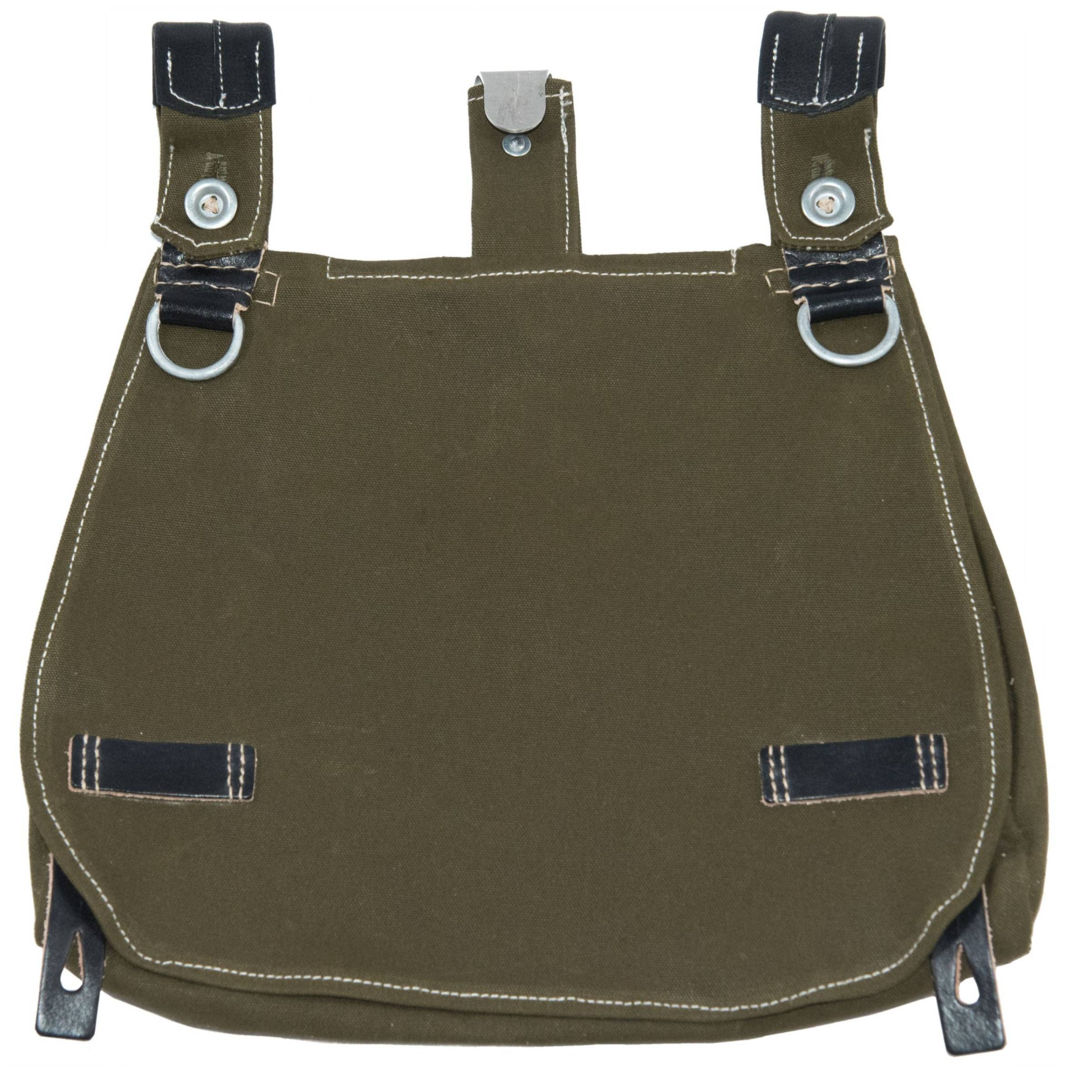 Perfect repro of German breadbag M31. This kind of breadbags were used by all German ground forces. This model have black straps and belt loops. Breadbag is made of green cotton canvas, reinforcements and leather made of natural color, made of natural, vegetable-tanned black leather. All hardwares were made of aluminium.