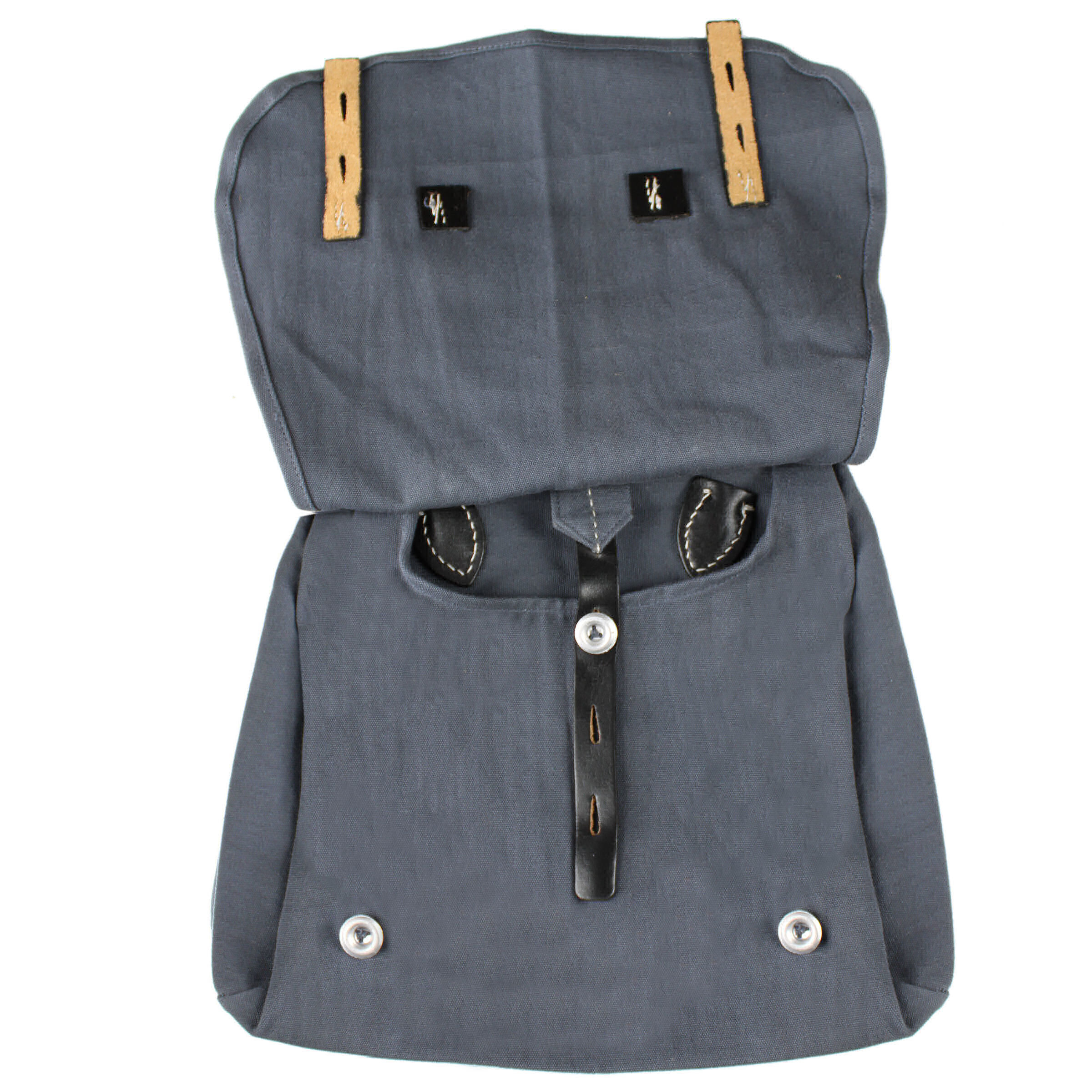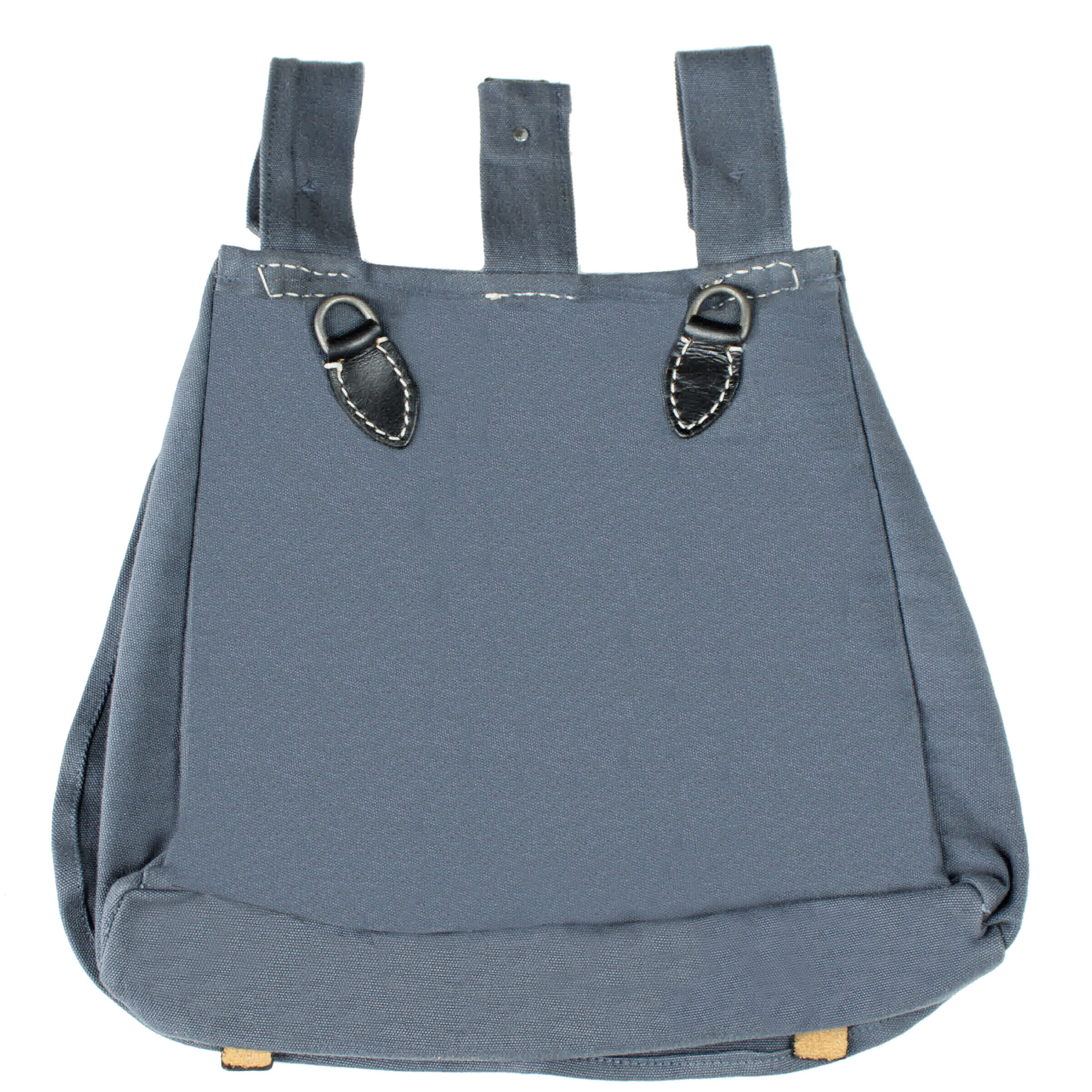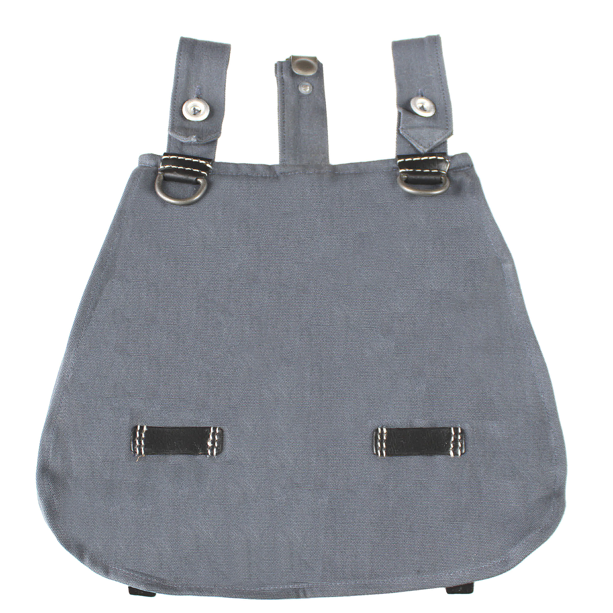 A faithful replica of the Luftwaffe M31 bread bag in the late war production version. The bread bag is made of cotton canvas material, in the late war version, without leather reinforcements on the carrying straps. Straps and leather grommets made of smooth black leather. D-rings made from steel and painted. Buttons are aluminium.