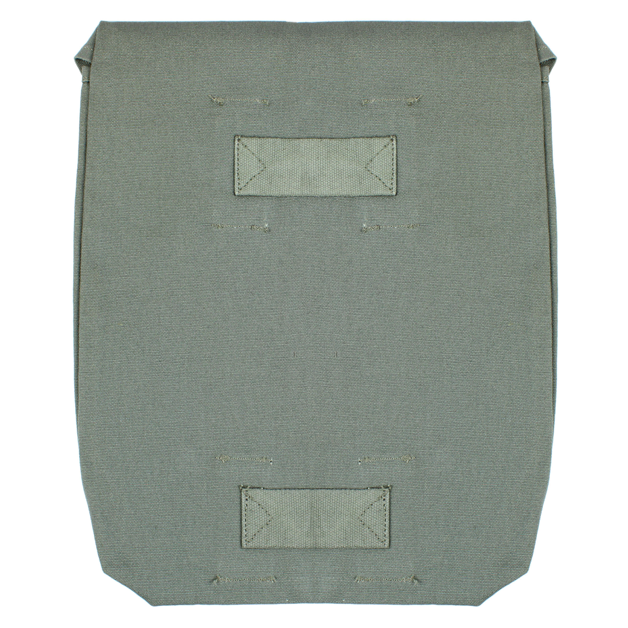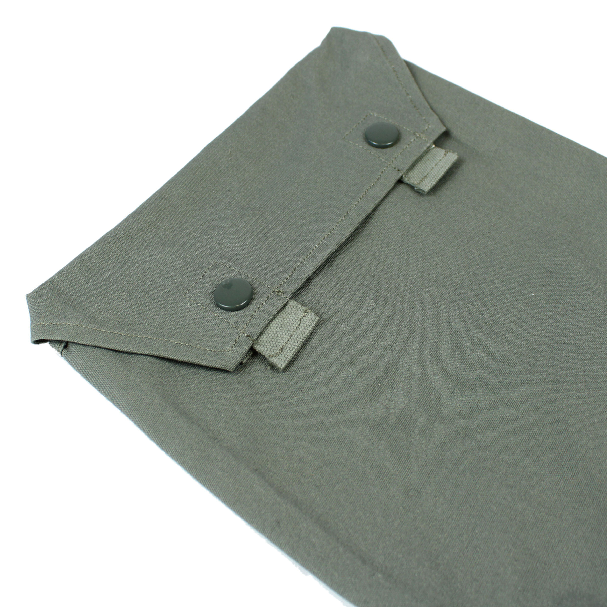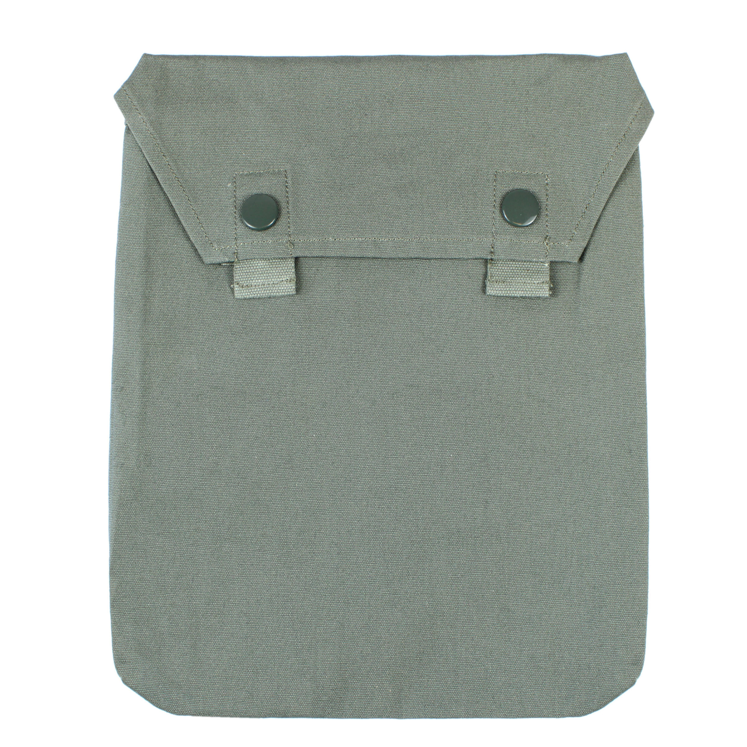 A perfect replica of a late-war version gas cape pouch – not rubberized. The pouch is fastened with 2 snaps, has strap loops on the back for attaching to equipment, it is made of cotton fabric.