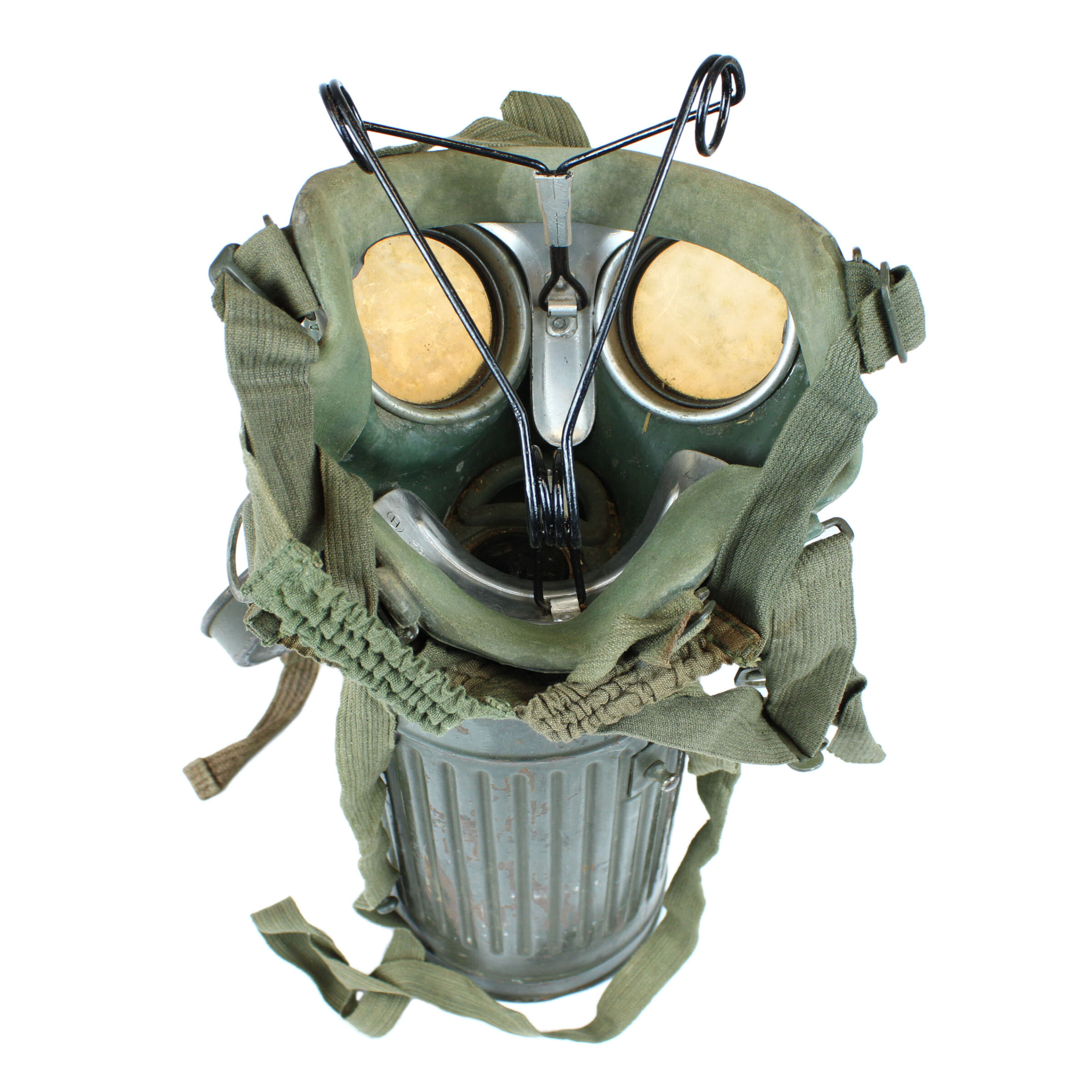 These tensioners were used in the German Army throughout World War II. They helped maintain the correct shape of the mask during long-term storage. During combat operations, the tensioner was removed and the mask stored in canisters or cases with personal equipment.
