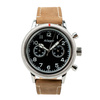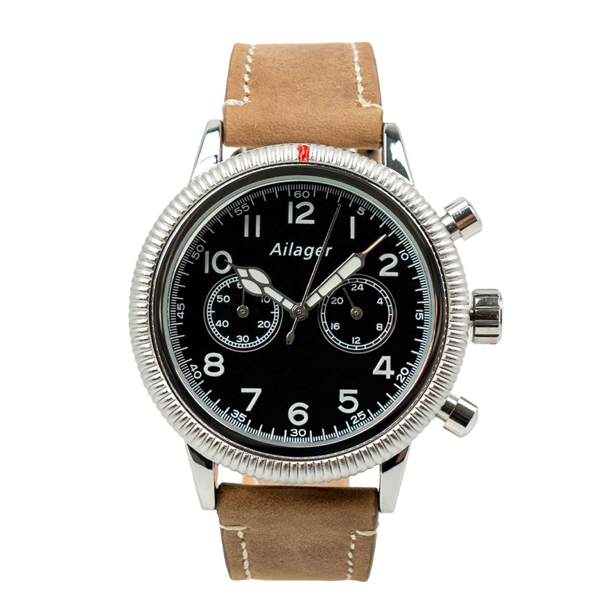 A replica of a German Luftwaffe pilots service watch based on a 1939 model, manufactured by the renowned Ailager® brand. Each watch features a borwn, 25 cm smooth leather strap, finished with a traditional silver metal buckle on one side. The watch face is housed in a nickel-plated stainless steel case. The back of the dial is embossed with the words "Wasserdicht Stahlboden", which means "waterproof steel base". On the outside of the face, the non-slip bezel gives you count-down and count-up options with its single striking red dash. The black dial is framed around the edge by large, easy-to-read luminous numerals. On the face main time is kept by the central minute and hour hands in a classic style for maximum illumination, complemented by 24-hour time kept on the right sub-dial. This is where Ailager has stepped away from the originals, making the decision to embrace modern movements and replacing the original 30-minute dial with 24 hours, a more functional choice for daily wear. Chronographer functions are controlled by the pushers, the top for stop/go and the lower for resetting the stopwatch, returning the central second hand and left minute sub-dial.