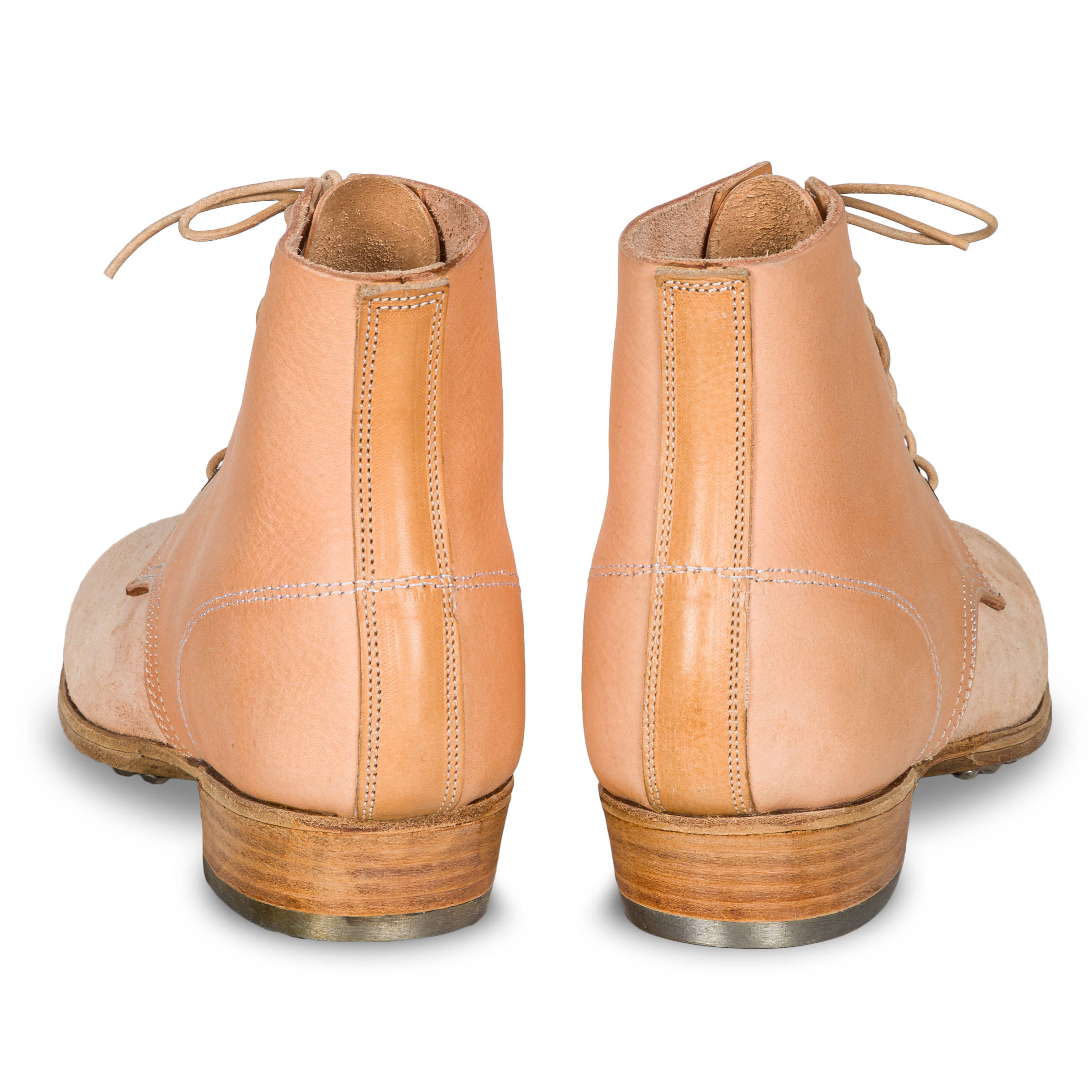 Replica of german M43 ankle boots. They're made of 100% natural, vegetable tanned cow leather 2,5-3mm thick. All uppers is stitched rough side out. 8 pairs of eyelets. Heel is 5 to 6 layers of compressed leather made of Italian sole leather. Heel is pegged through the sole. Sole stitched to the upper (blake method). Outer sole is glued, stitched and wooden-pegged to the sole (sole and outer sole made of Italian sole croupon leather). Soles made of sole croupon. Boots are fully impregnated.