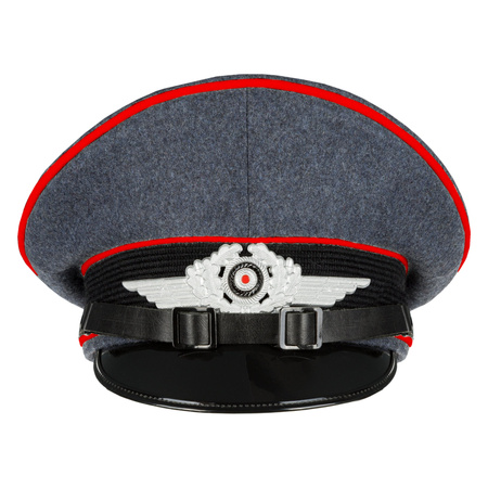 Perfect replica of Luftwaffe anti-aircraft artillery service visor cap. Made of high quality German blue grey wool, red piping, LW cockade included. This beautiful cap is made by EREL - Robert Lubstein Militärmützenfabrik, famous German cap maker with over 110 years of traditions. Cap has all the EREL markings, 100% identical to period ones. We highly recommend You to buy such replica from maker which produced caps for German Army during World War I and World War II.