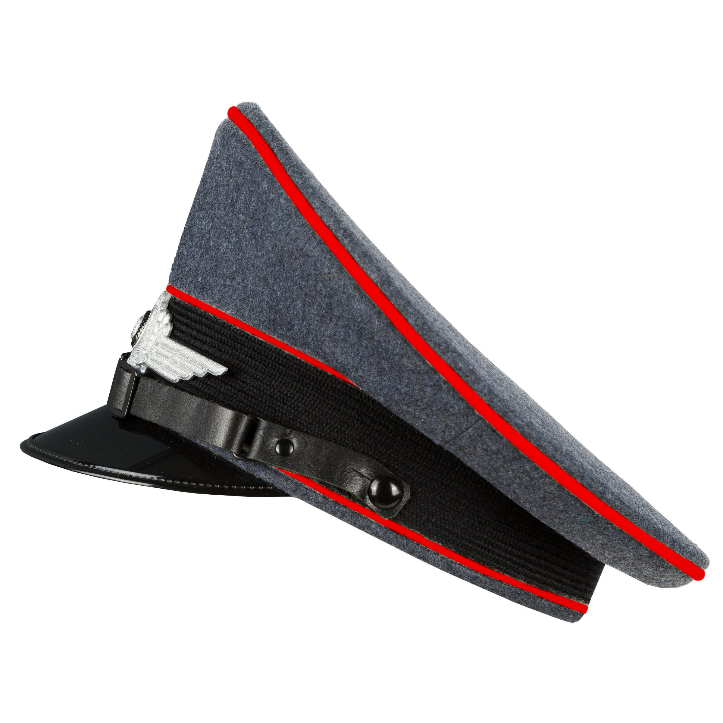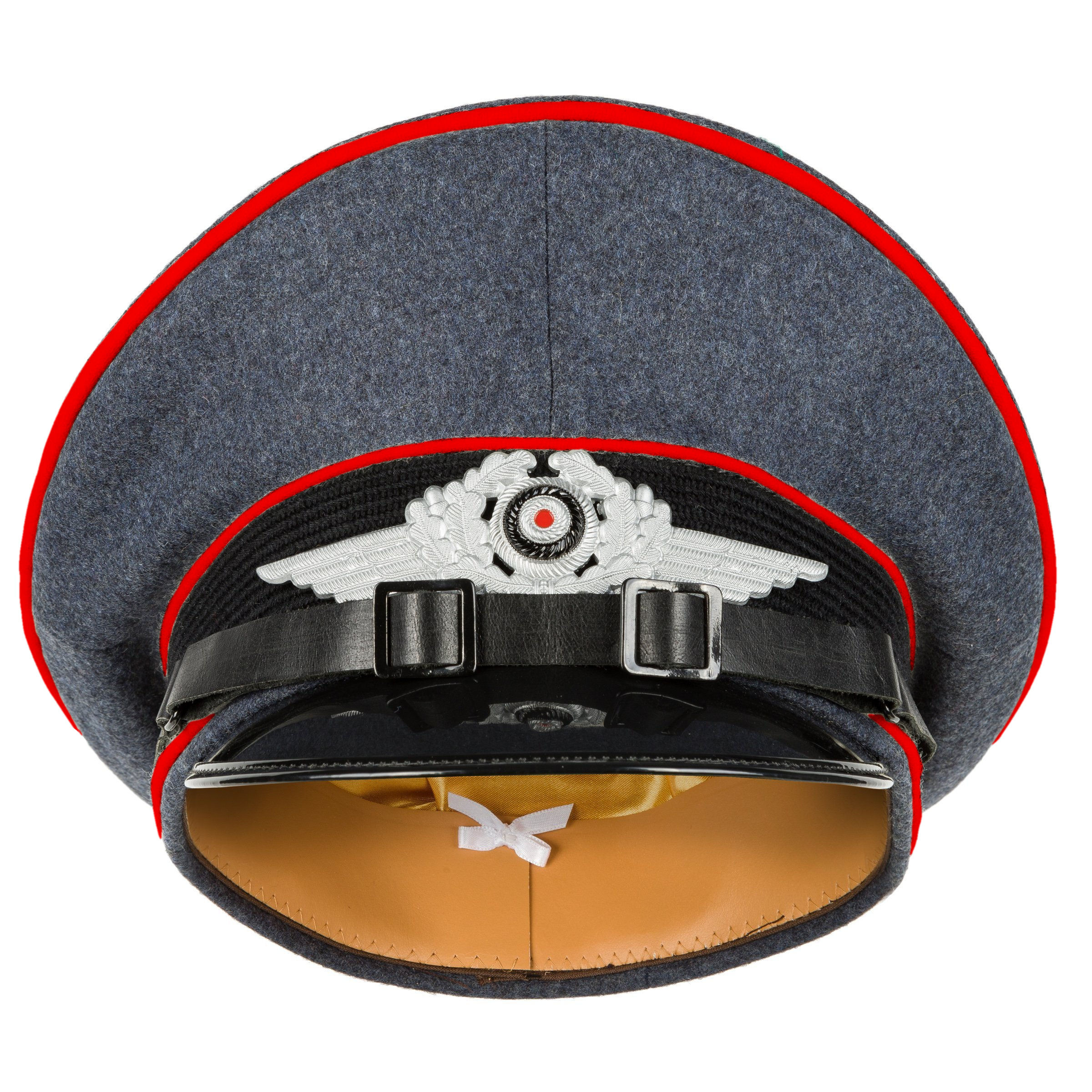 Perfect replica of Luftwaffe anti-aircraft artillery service visor cap. Made of high quality German blue grey wool, red piping, LW cockade included. This beautiful cap is made by EREL - Robert Lubstein Militärmützenfabrik, famous German cap maker with over 110 years of traditions. Cap has all the EREL markings, 100% identical to period ones. We highly recommend You to buy such replica from maker which produced caps for German Army during World War I and World War II.