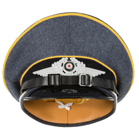 Perfect replica of Luftwaffe service visor cap. Cockade with wings included, the cap has yellow piping - flying personnel. This beautiful cap is made by EREL - Robert Lubstein Militärmützenfabrik, famous German cap maker with over 110 years of traditions. Cap has all the EREL markings, 100% identical to period ones. We highly recommend You to buy such replica from maker which produced caps for German Army during World War I and World War II.