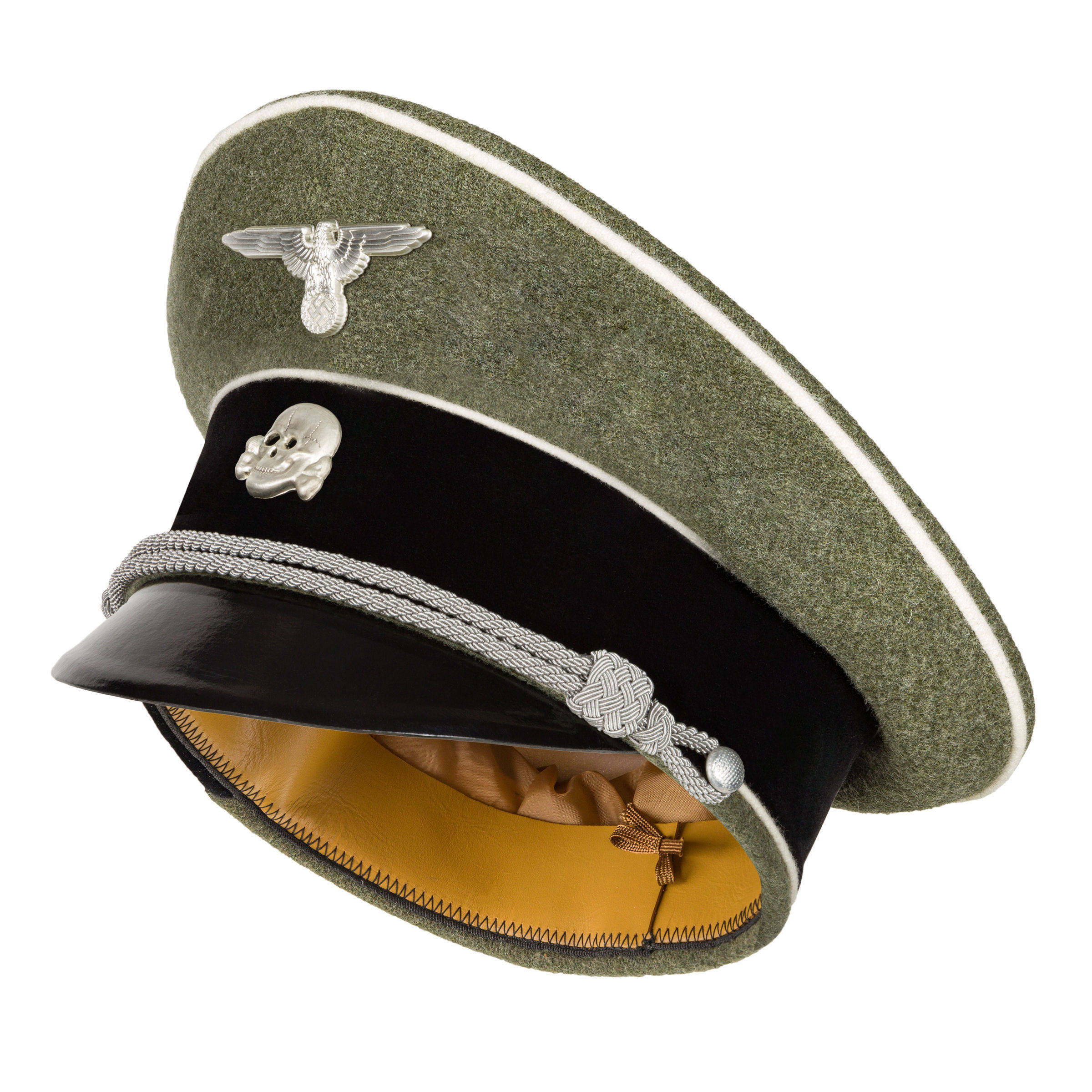 Perfect replica of Waffen SS wool visor cap. The cap is made of feldgrau wool with a white piping (infantry), while the sweatband is made of cream-coloured leather. The visor is black and varnished. The cap has a cord which is made of silver beading thread, attached with silver pebbled buttons. The cap has metal insignia - adler and skull.