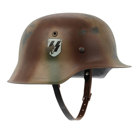 • HIgh quality steel repro of German M42 helmet with Waffem SS decal, painted in Normandie camo, heavily aged version.