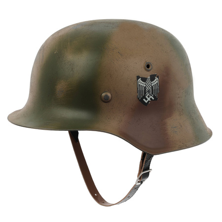 • HIgh quality steel repro of German M42 helmet with WH decal, painted in Normandie camo, sligthly aged version.