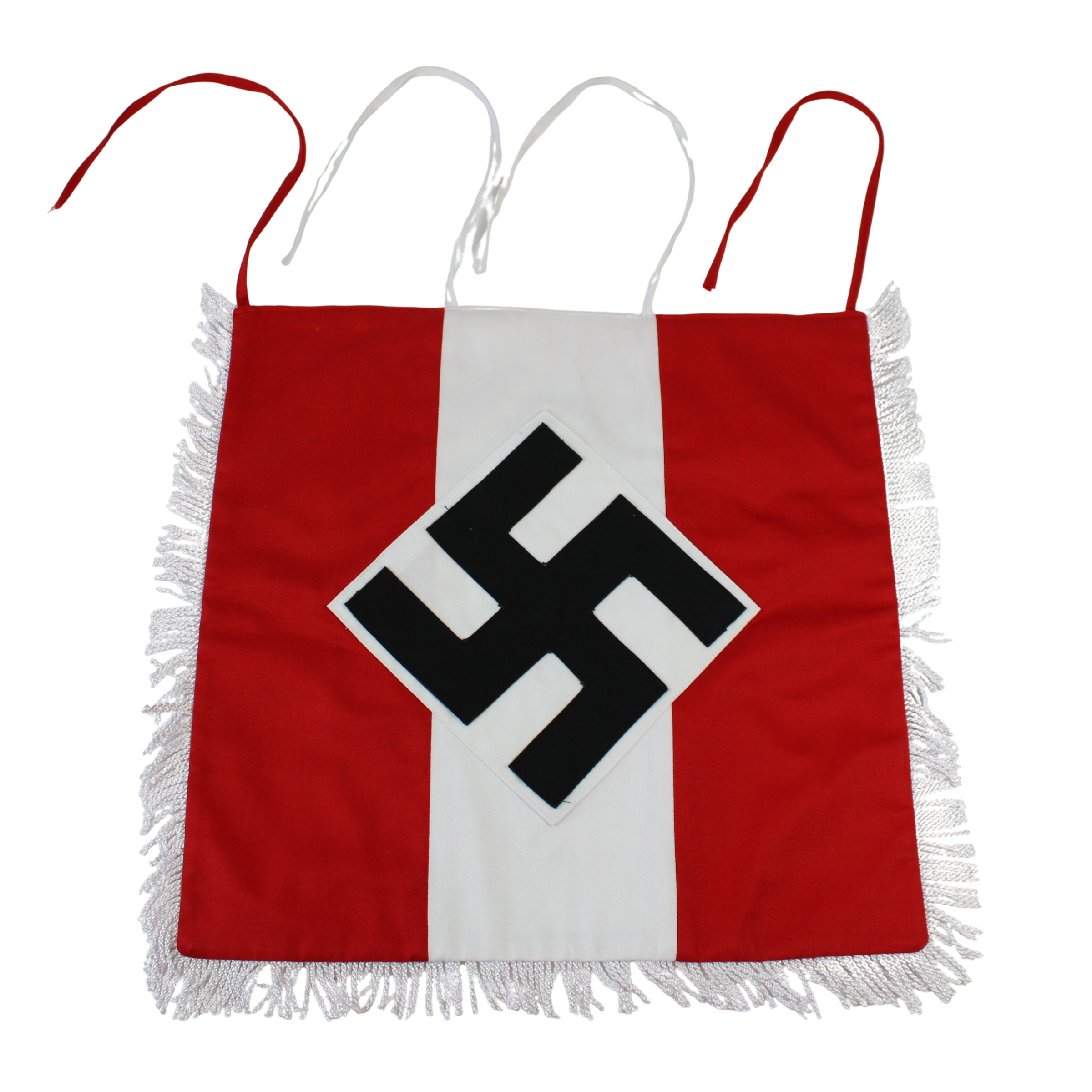 A replica of a Hitler Youth trumpeter's pennant. The pennant is made by sewing together cut pieces of fabric. Decorative fringes are sewn onto three edges. One side has four ribbons for attaching to the trumpet.