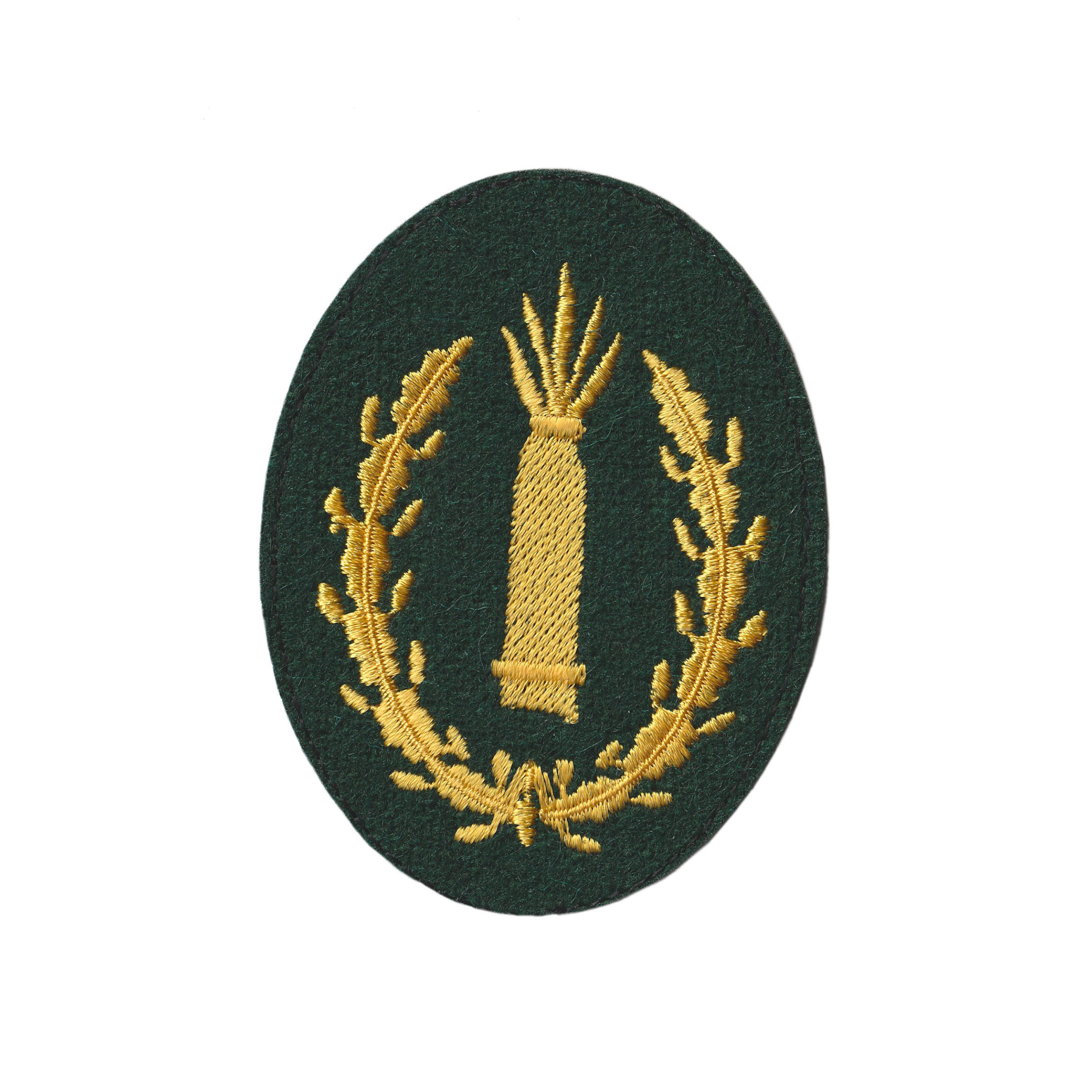 A perfect replica of military specialization patch for soldiers serving in the Heer. The patch is embroidered with yellow cotton thread on a dark green cloth backing.