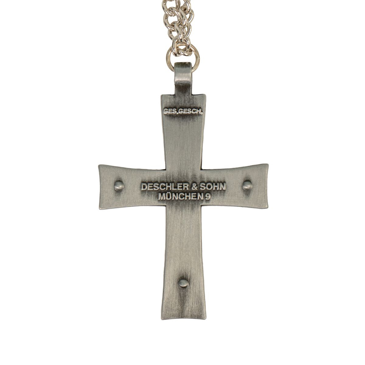 A replica of the German Catholic cross of the Wehrmacht chaplains. Both the crucifix and the chain are made of metal. The chain is 76 cm long.