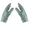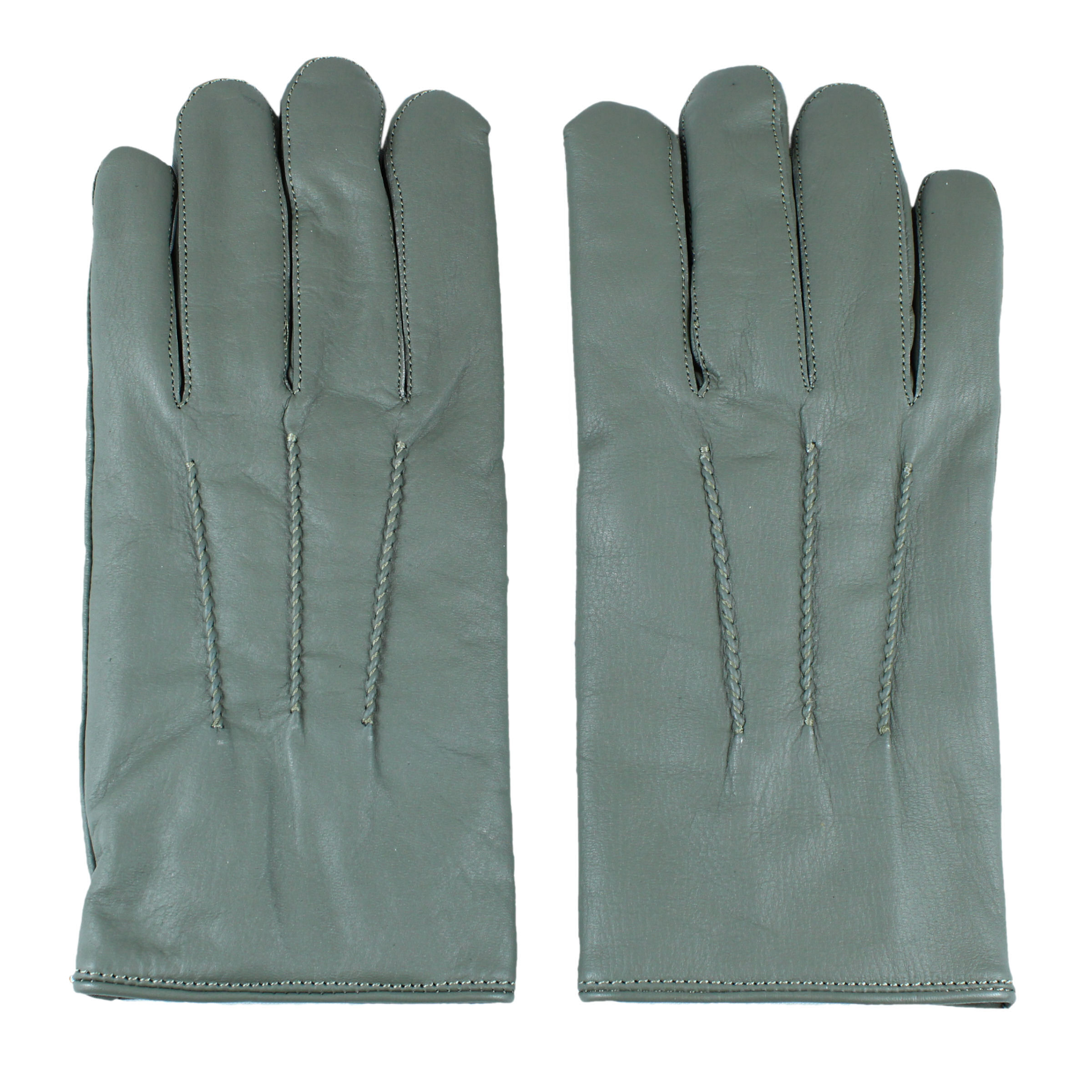 A replica of winter field gloves. Made of natural, full-grain leather in gray. Wool fleece is used inside for thermal comfort. The outer side of the gloves features three stitching lines, and the wrist cuff fastens with a snap.