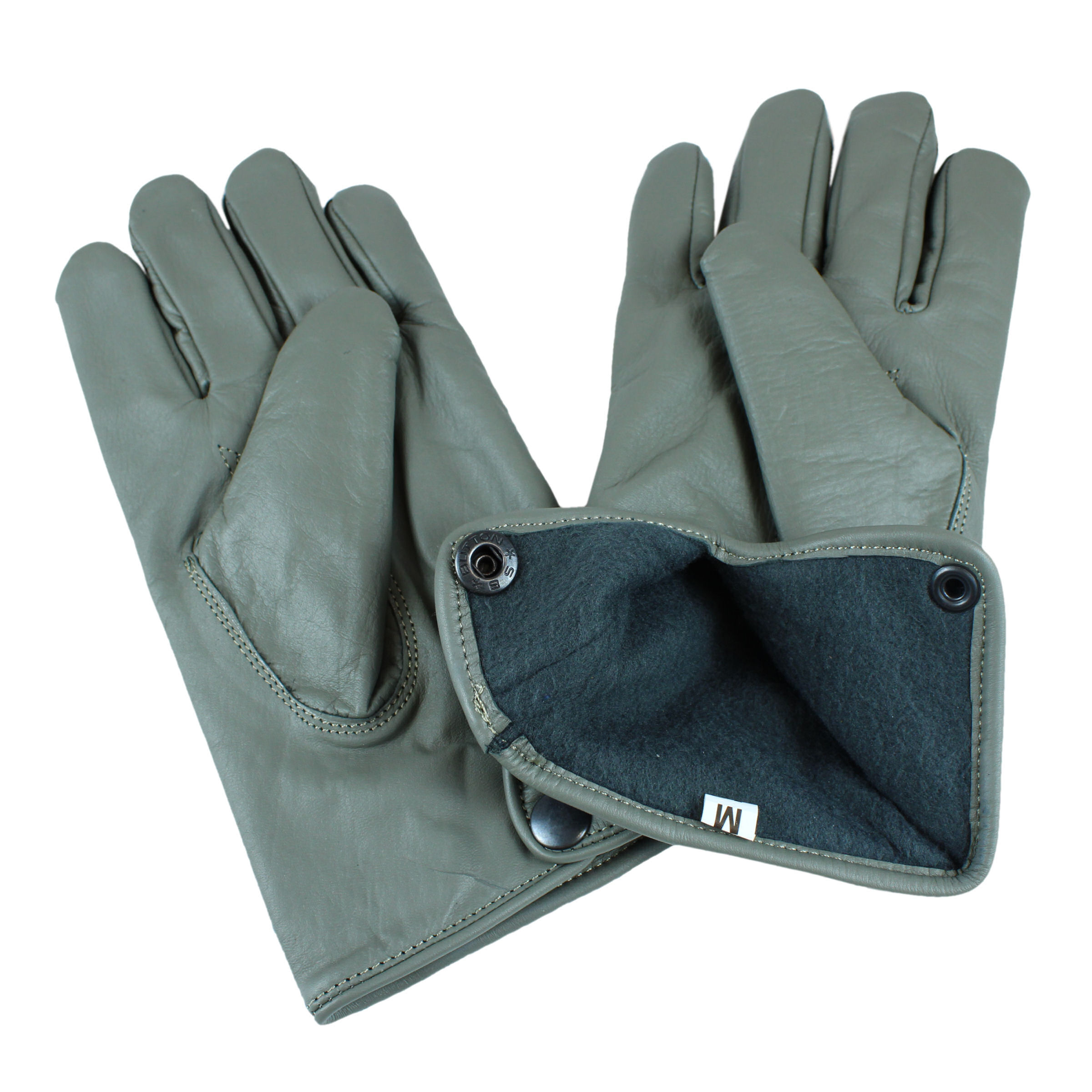 A replica of winter field gloves. Made of natural, full-grain leather in gray. Wool fleece is used inside for thermal comfort. The outer side of the gloves features three stitching lines, and the wrist cuff fastens with a snap.