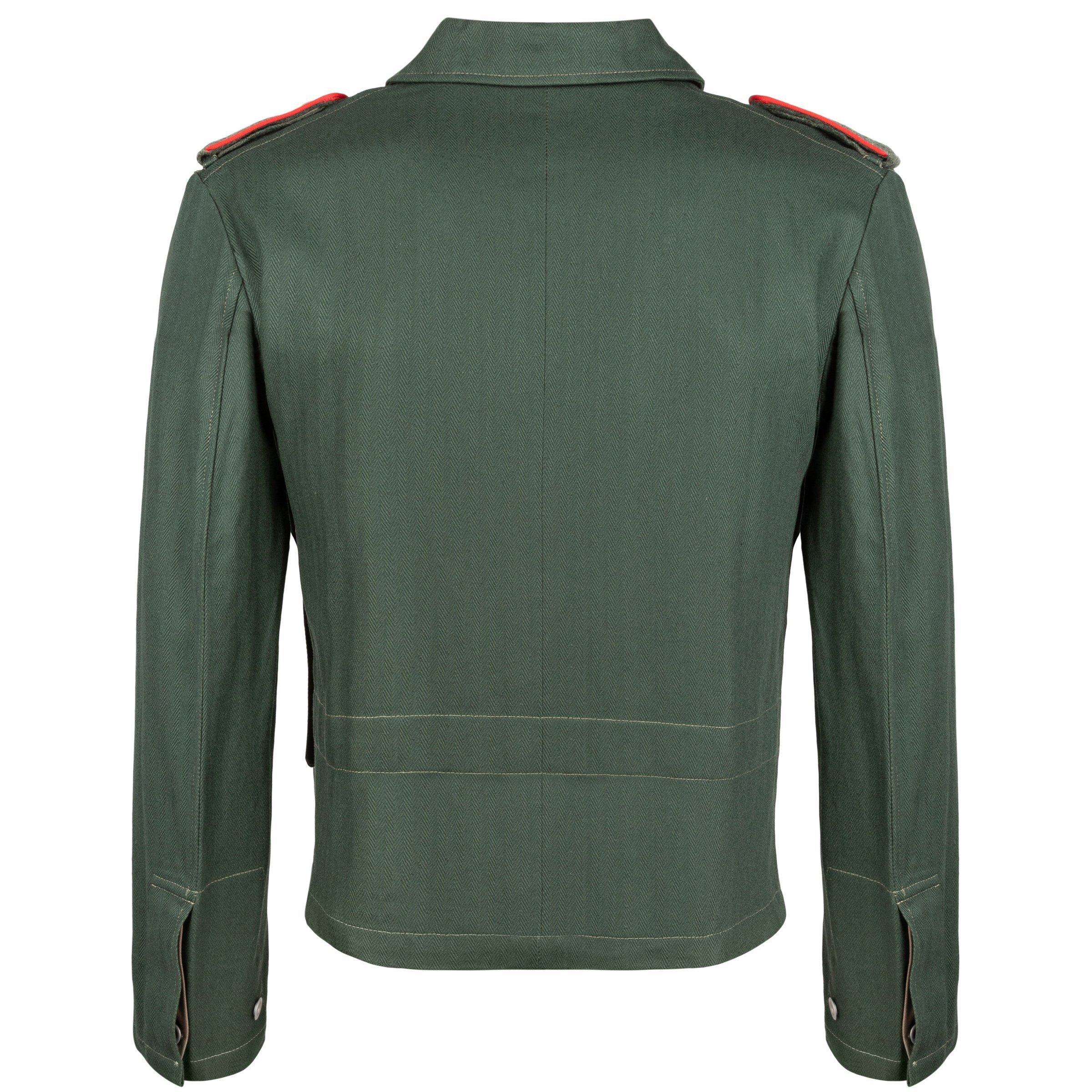 Perfect replica of summer HBT - Sturmgeschutzbluse. Made of perfectly recreated HBT fabric in dark green color. Buttons are made of zinc. Cut with big frontal pocket. Cut, fabric type and color are as close as it possible to original. Shoulder boards has red (artillery) piping, so called "waffenfarbe". Branded by Nestof®!