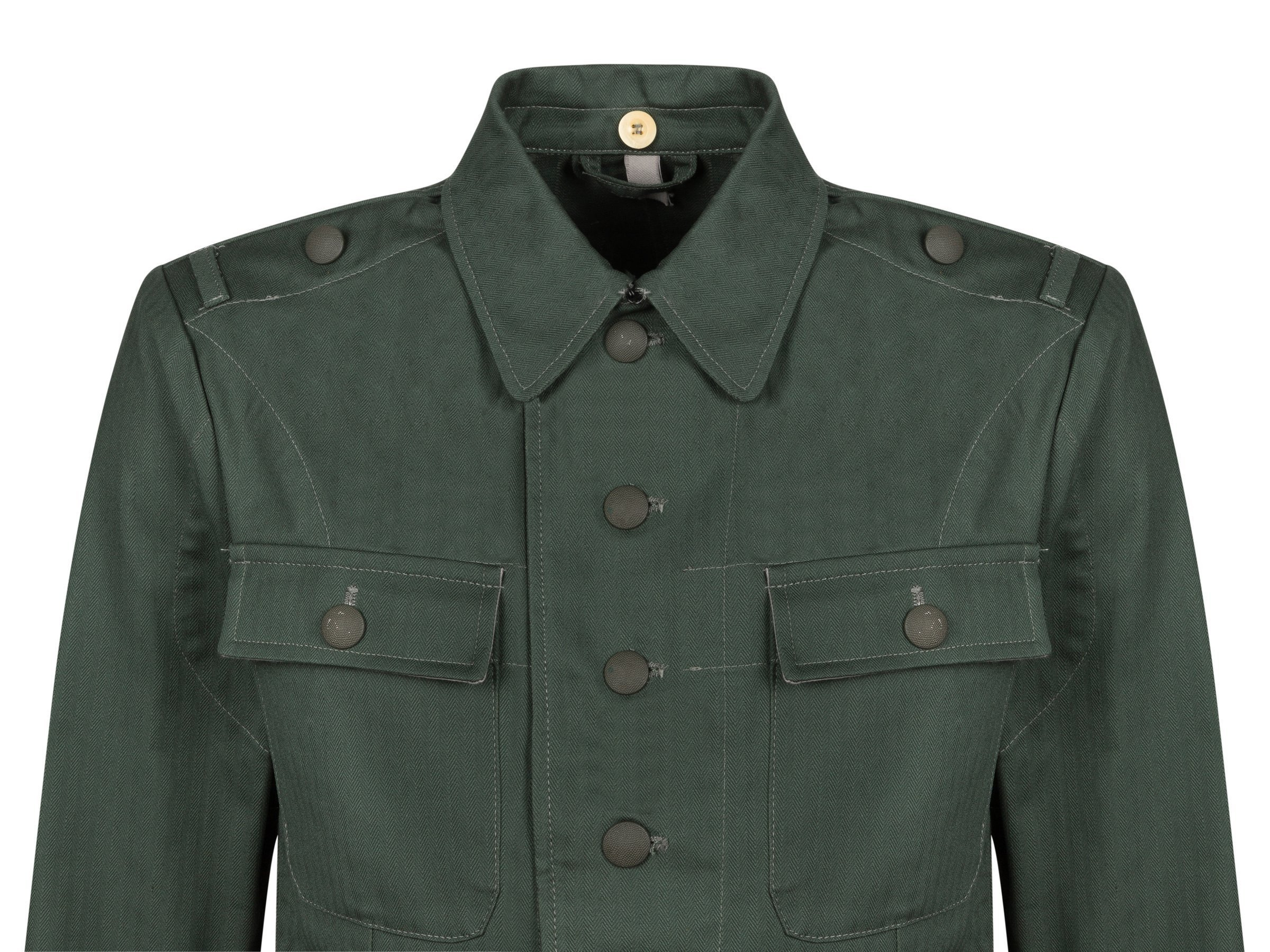 Perfect replica of summer HBT M43 tunic. These are made of natural cotton and sews. Cut, fabric type and colour are as close as it possible to original. Buttons were mounted on S-rings. Pockets are simplified as in orginal. Buttons on cuffs and for mount collar blind are original German buttons. Shoulder boards are not included. Highly recommended - made by Nestof®.