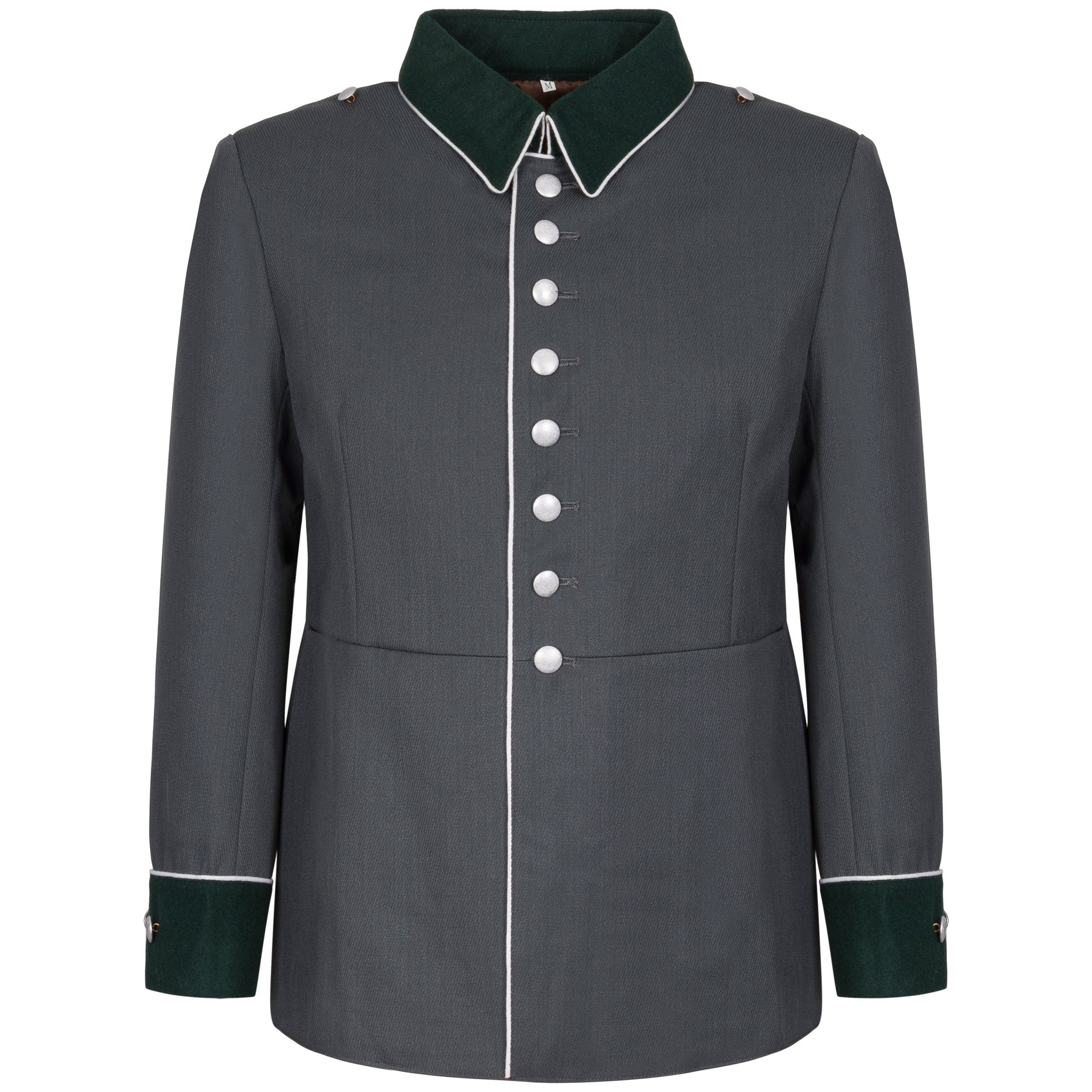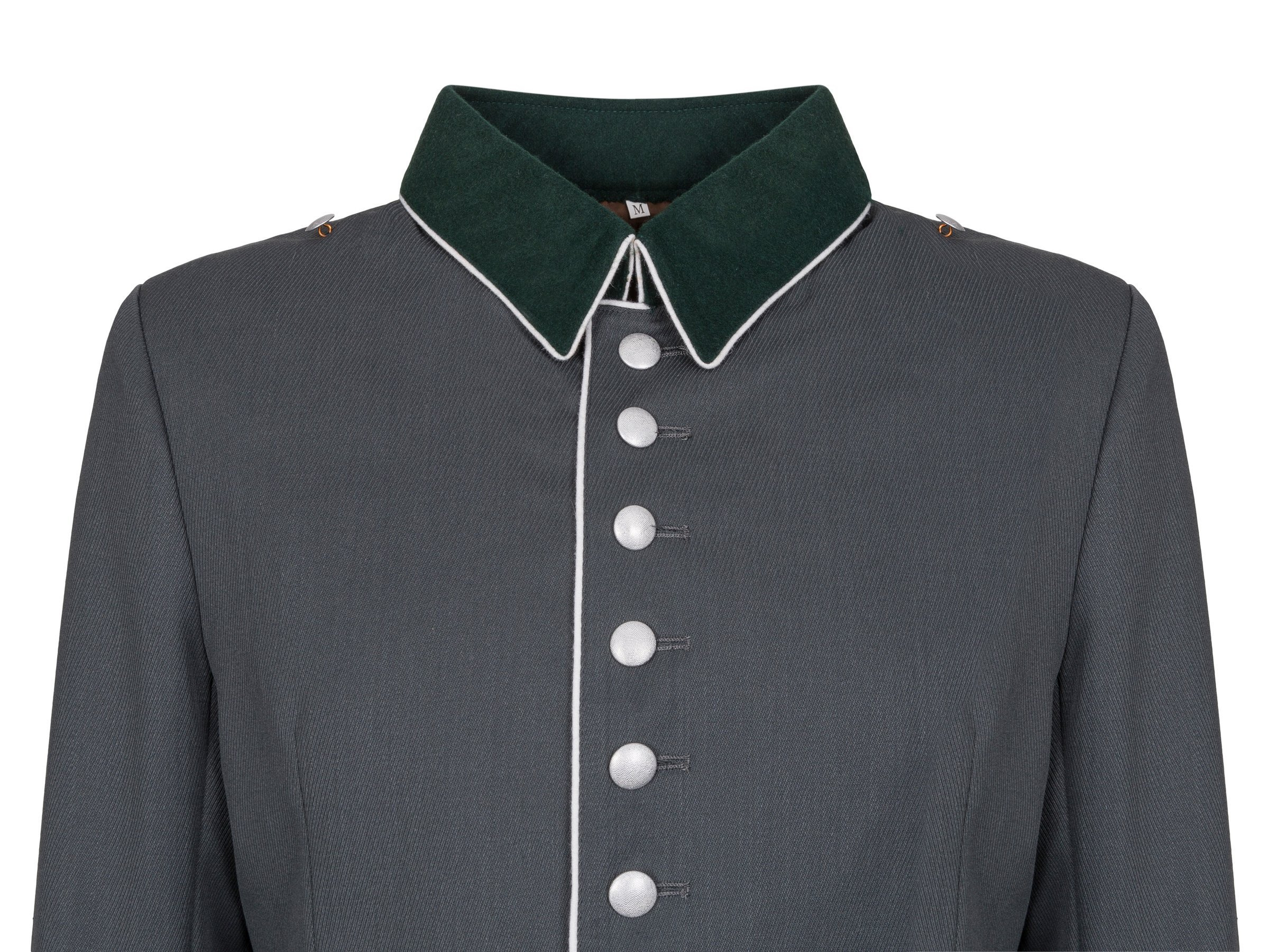 Perfect replica of Waffenrock parade gabardine tunic. All details made as in original uniform. Cut, fabric type and colour are also as close as it possible to original. Pebbled 2-part buttons, internal dagger hook, proper sleeves lining. Collar is made of bottle green wool. Tunic is with white soutache - for infantry. Premium class replica, branded by Nestof®!