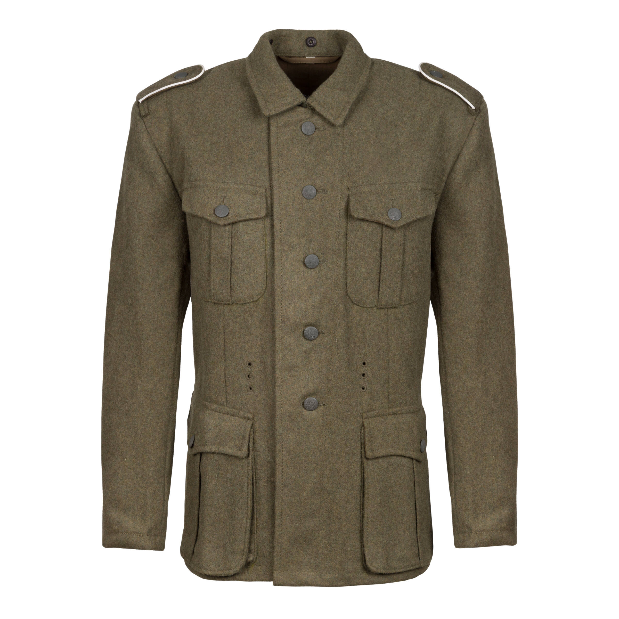 Replica of M40 field tunic for Wehrmacht and Waffen-SS. Made of wool with cotton liner. Tunic has 4 pockets, 5 buttons, additional inside pocket for first aid pouch. Field-gray collar is the main difference beetween this model and earlier one. Cut, fabric type and colour are as close as it possible to original. Shoulder boards in waffenfarbe of infantry (white) included.