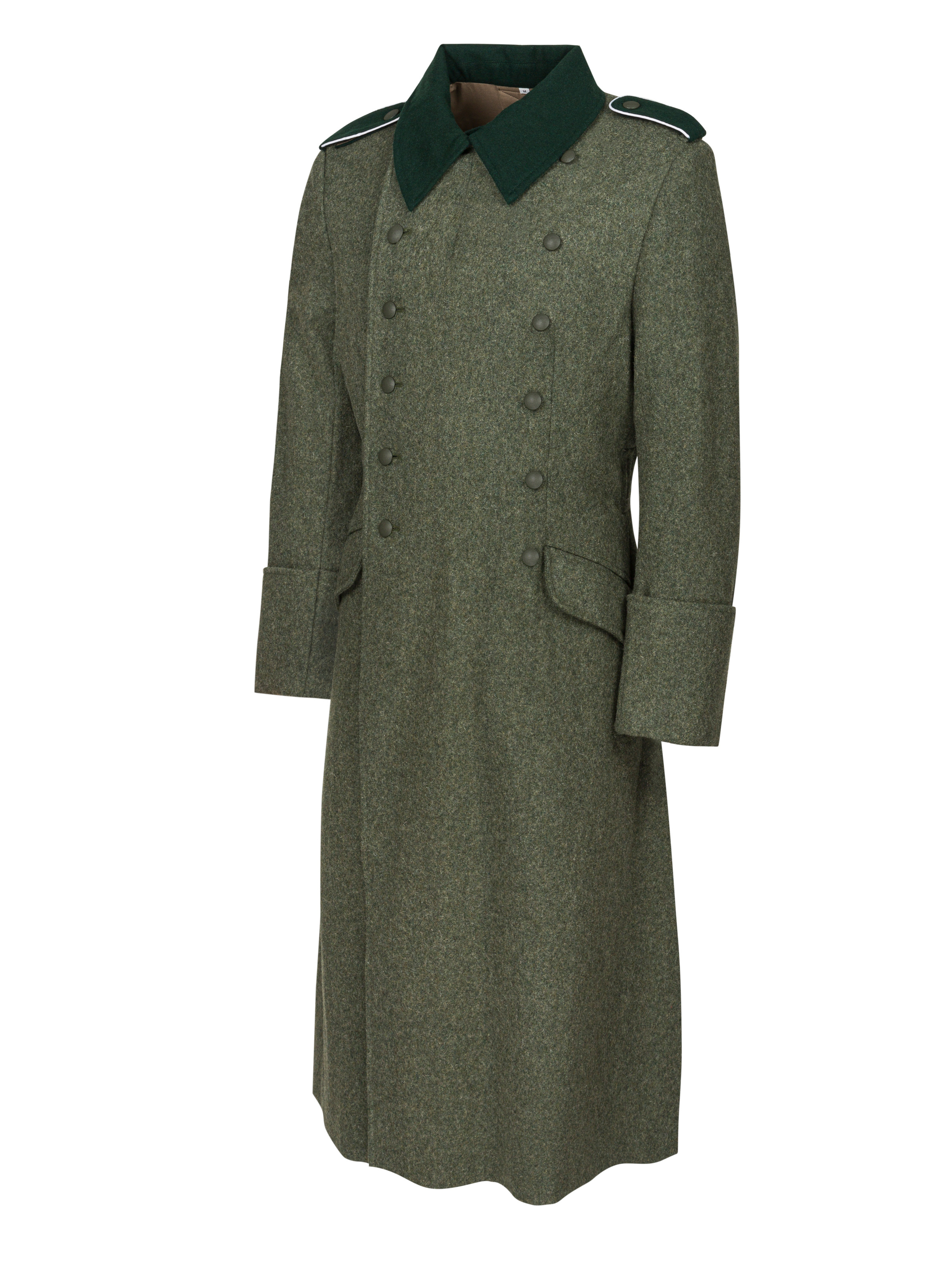 Perfect replica of M36 German field coat. Made of heavy field grey wool, with dark green collar. Collar trimmed with dark green cloth, cotton lining. Cut, fabric type and color are as close as it possible to original.