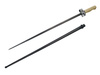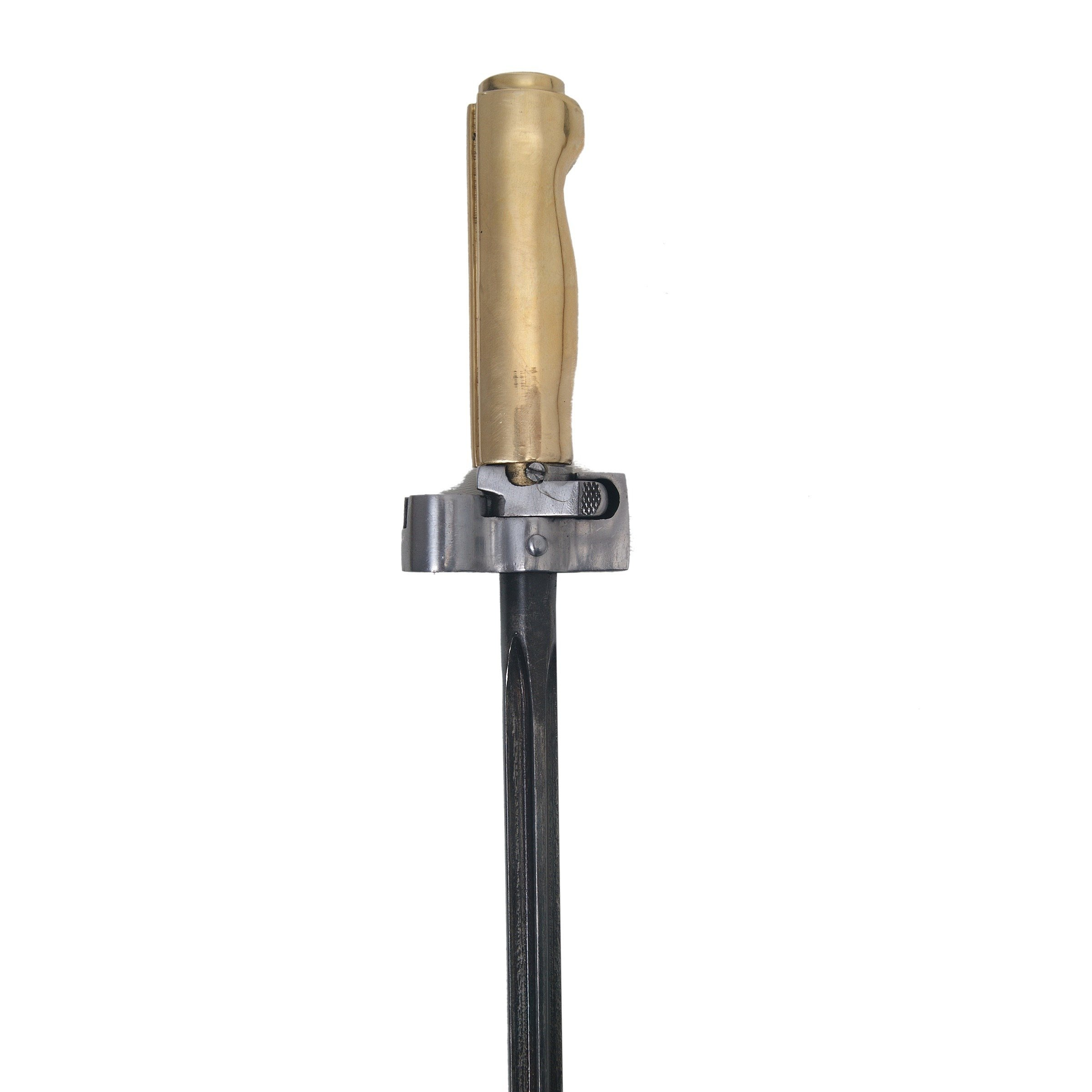 A perfect replica of the French Mle. 1886/93/15 bayonet for the Lebel rifle. The bayonet is made of steel, with a brass handle and a steel scabbard. Compatible with our frogs. This is a war version of the bayonet, a modification from 1915, where the crossguard was abandoned, as it proved useless on the battlefield and even interferes with wearing equipment. During this same period, brass began to be used as a material for handles.