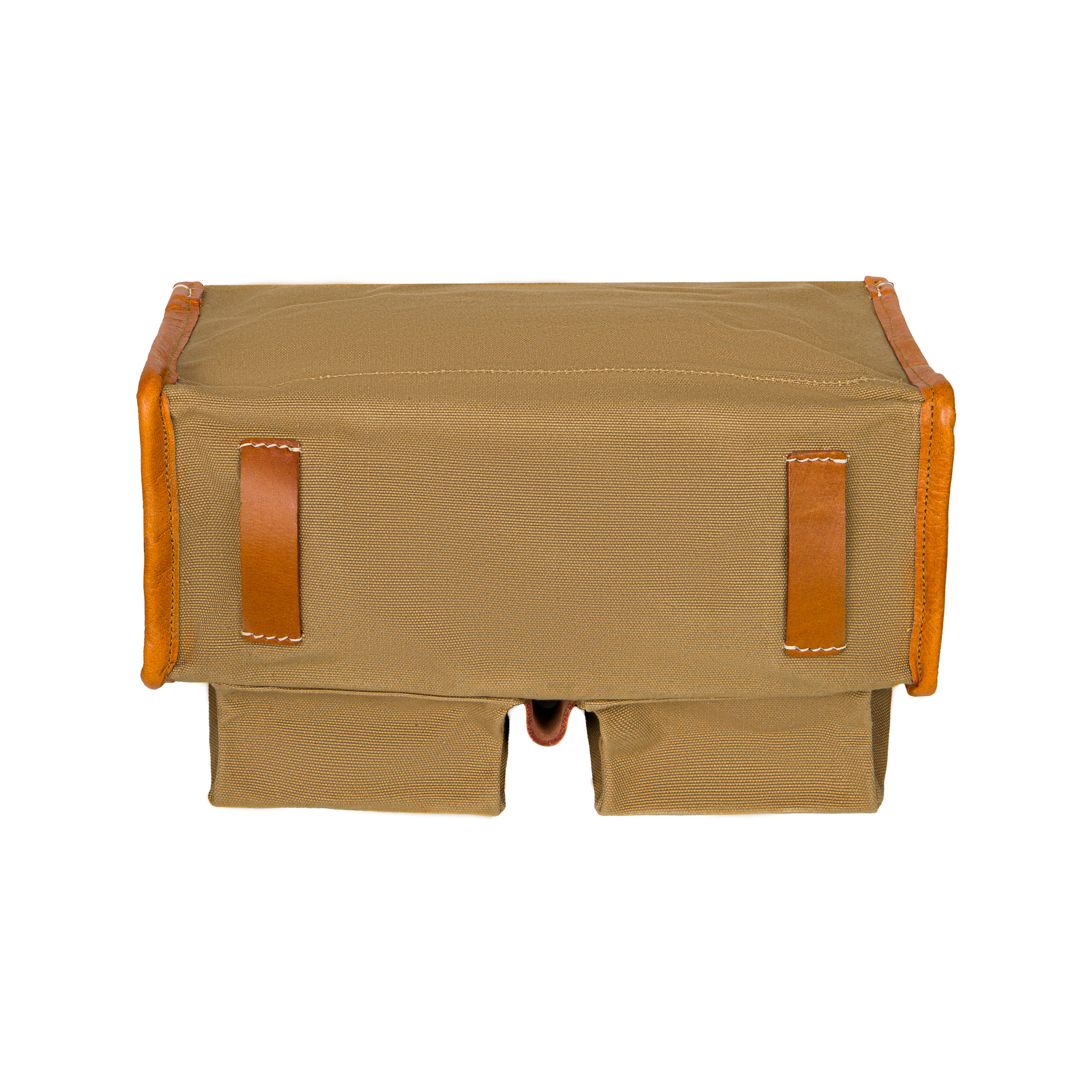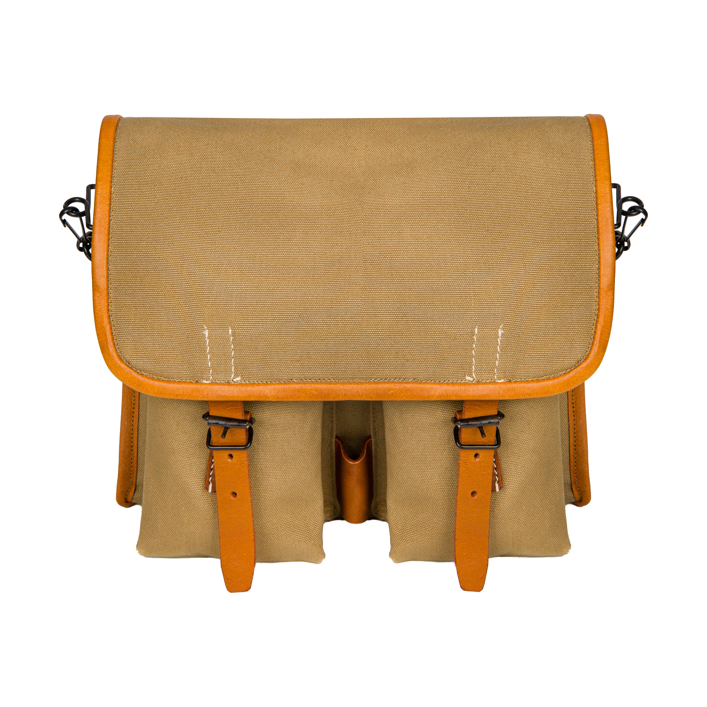 A faithful replica of a French 1935 model bag/haversack. The bag is made of beige cotton fabric trimmed with brown full-grain leather inserts. Closed with a one-piece flap using two leather straps. There are two smaller pockets sewn on the front wall of the bag. Leather belt loops are sewn onto the sides and bottom. The bag comes with an adjustable shoulder strap made of cotton webbing.