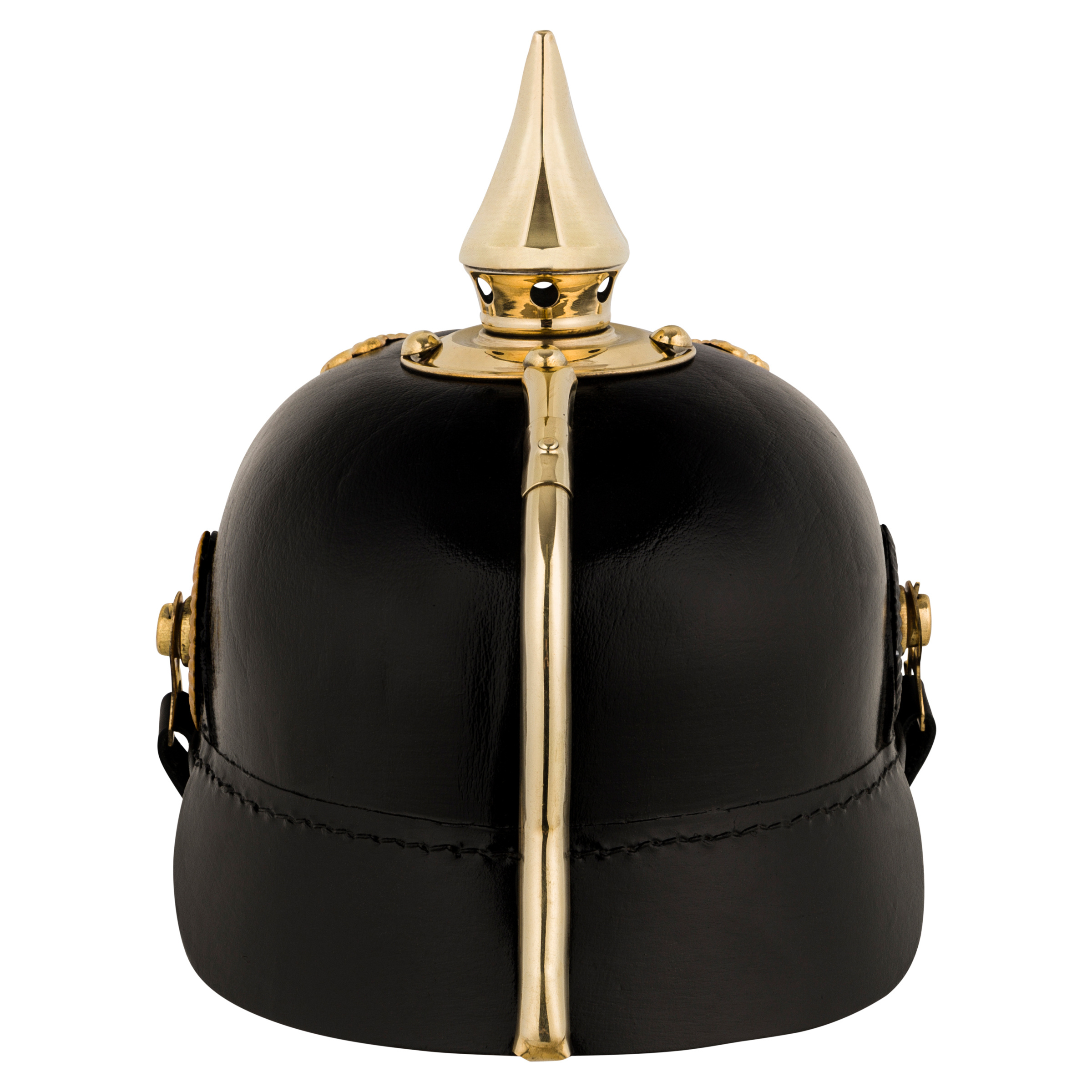 The subject of the offer is a perfect replica of the Pickelhaube M1895 in the Colonial Army version with the coat of arms of the German Empire. The pickelhaube in a universal size, has a leather insert and lining. There are rosettes on the sides. One in the national colors of the German Empire, the other in the colors of the federal state. The replica is made of natural patent leather using the embossing method, brass insignia.