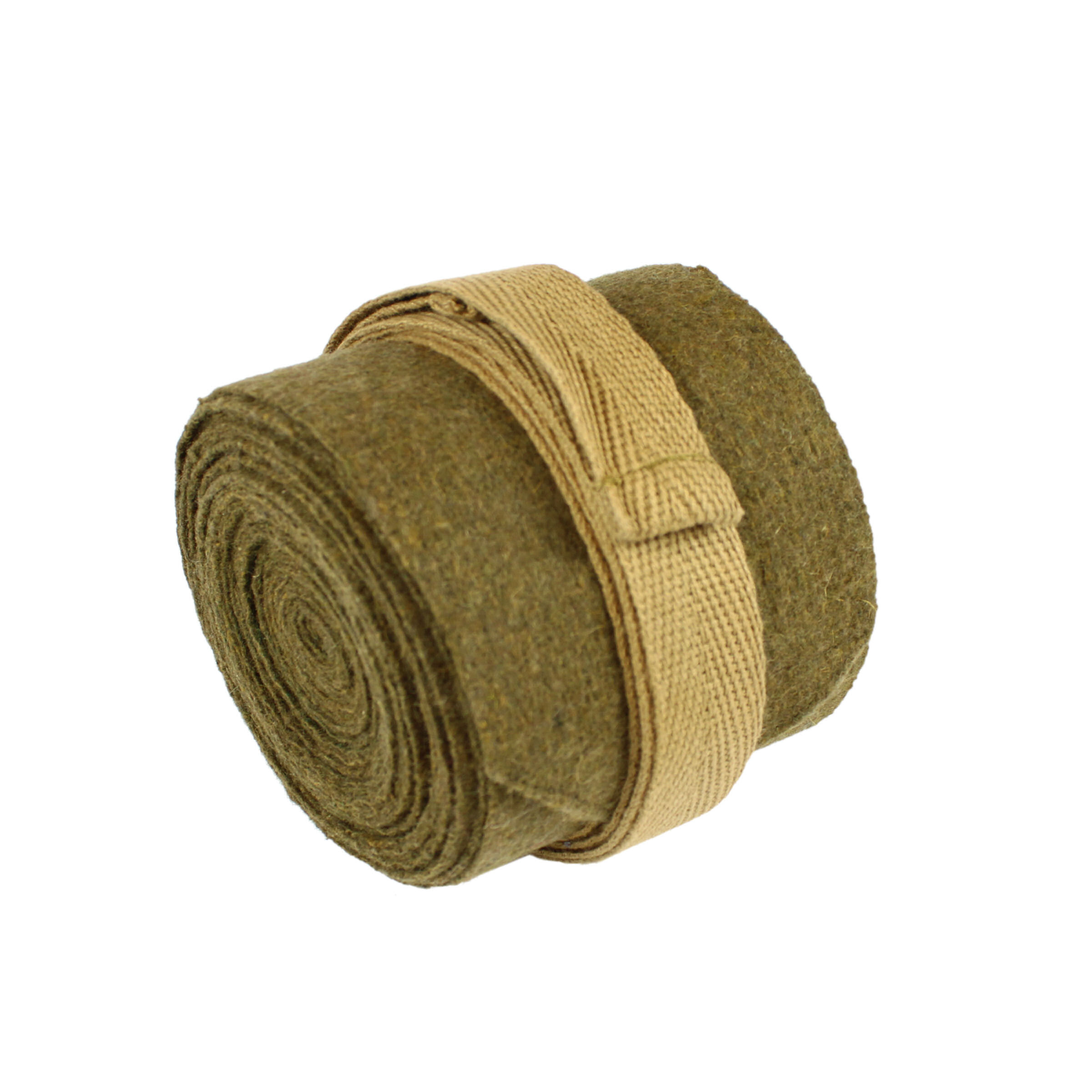 A replica of the M1907 Service Dress uniform puttees. Made of thick khaki (Service Drab) woolen serge fabric, intended to provide camouflage and durability in trench conditions. The length of the fabric part is approximately 310 cm. The puttee is finished on one side with a cotton ribbon in an HBT weave, approximately 95 cm long. Puttees was used to protect from dirt, mud and other contaminants from getting into the shoes.