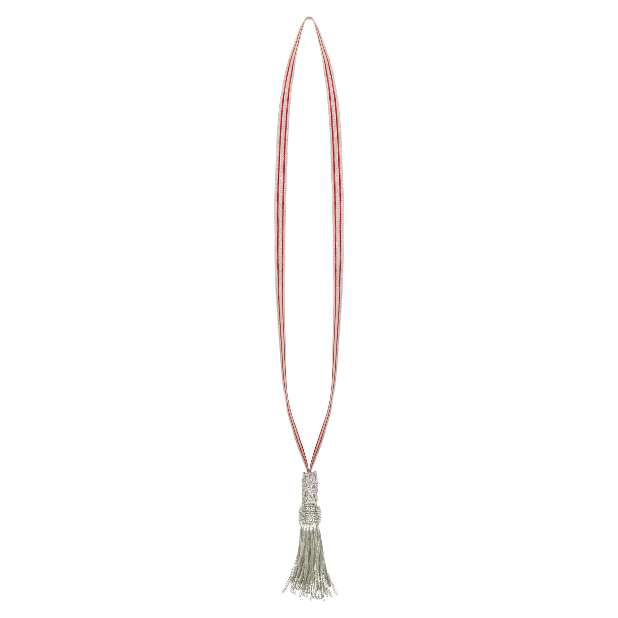 A replica of the Polish model 1919 saber knot for the wz. 1919 and wz. 1921 sabers, in the officer's version. The loop is made of silver bullion with two crimson stripes. The oval-shaped tassel is open at the bottom. Width of the ribbon: 1.5 cm; length of the loop: approx. 41 cm; length of the tassel (fringe): approx. 12 (7) cm.