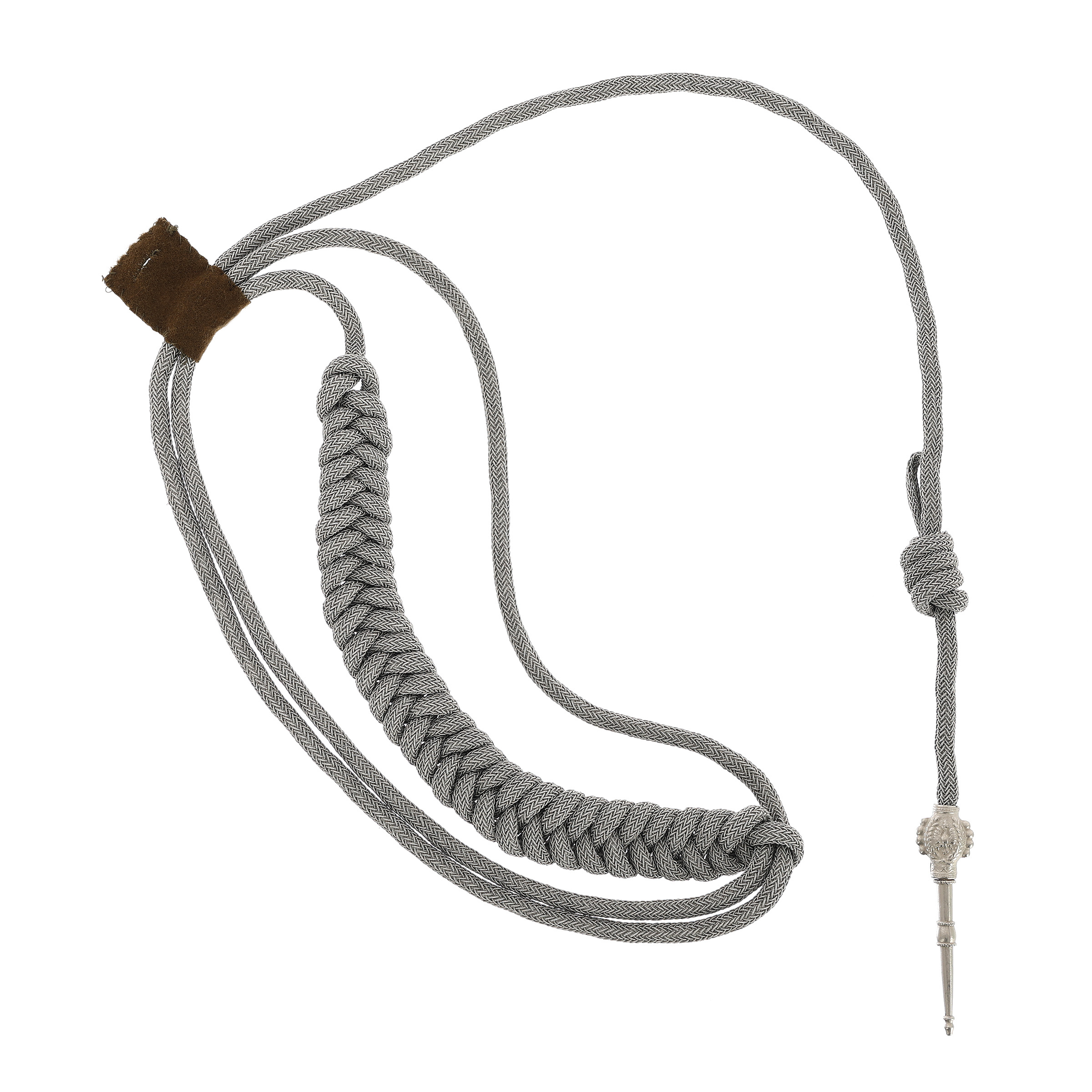 A replica of a Polish officer's cord for service and evening uniforms for gendarmerie officers of the Polish Army. The bullion cord is made of braided metal threads oxidized to antique silver (bajorek), with a single braid. Silver-plated metal fittings.