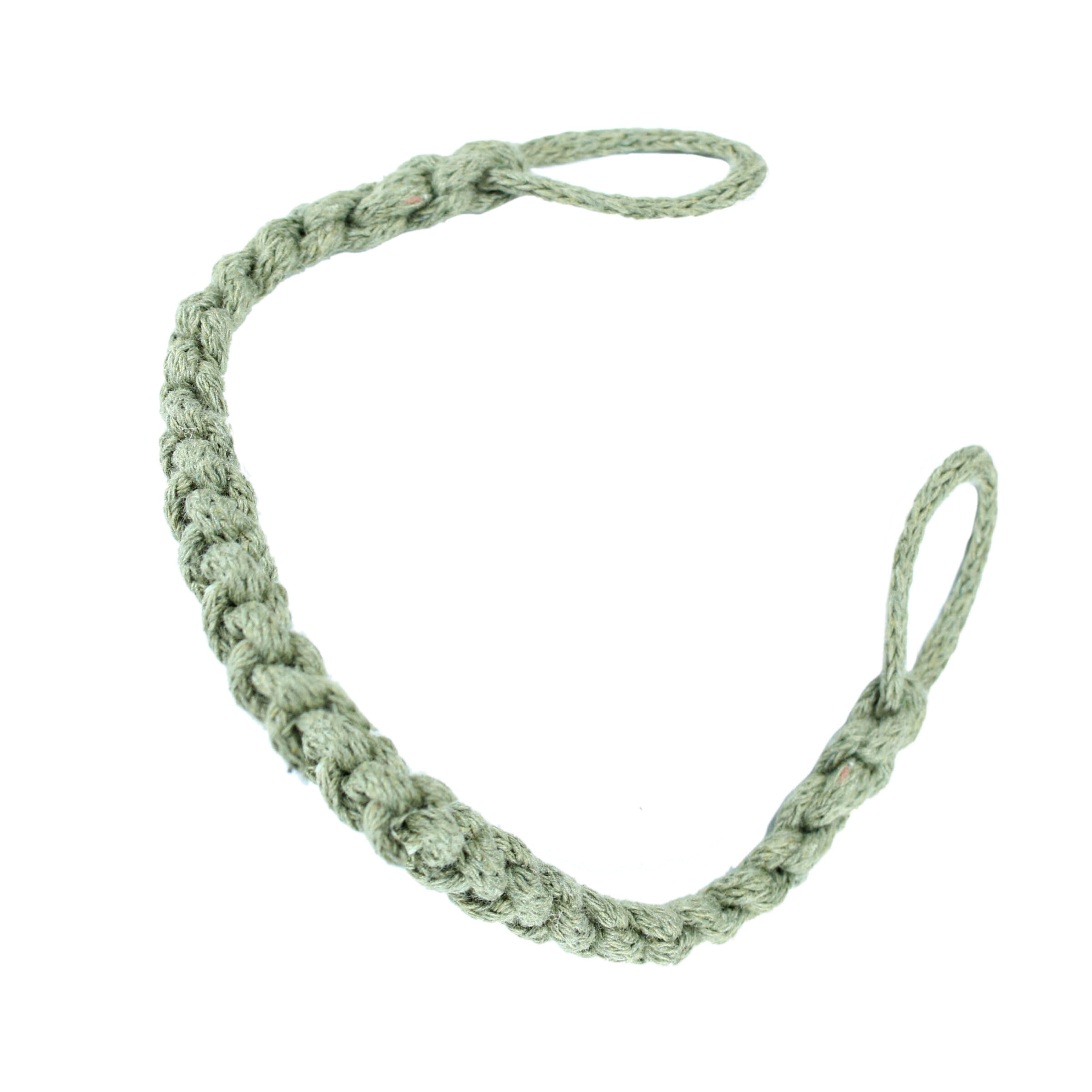 A replica of a Model 31 signal whistle cord. Made of braided cotton cord with a unique weave, with one loop for attaching to the whistle and the other to the shoulder strap.