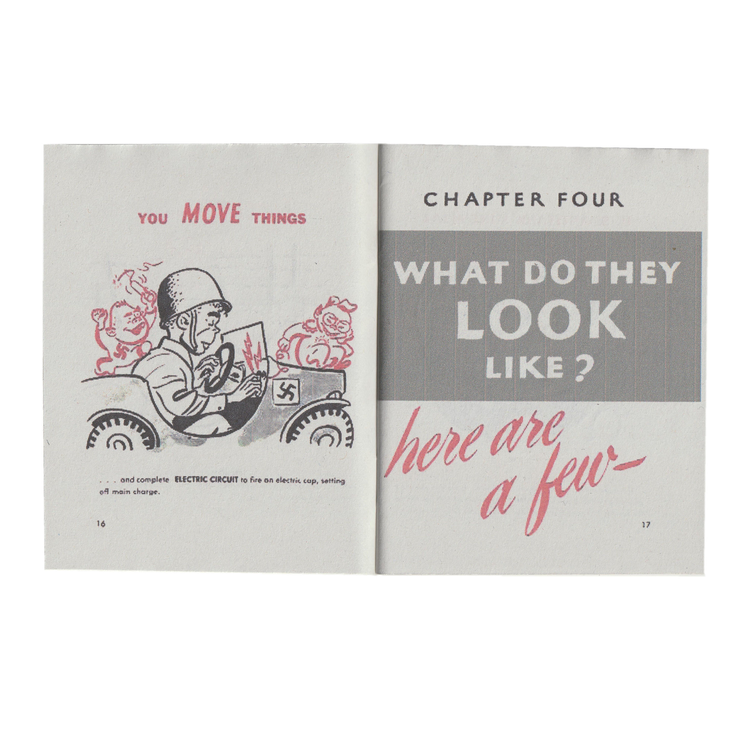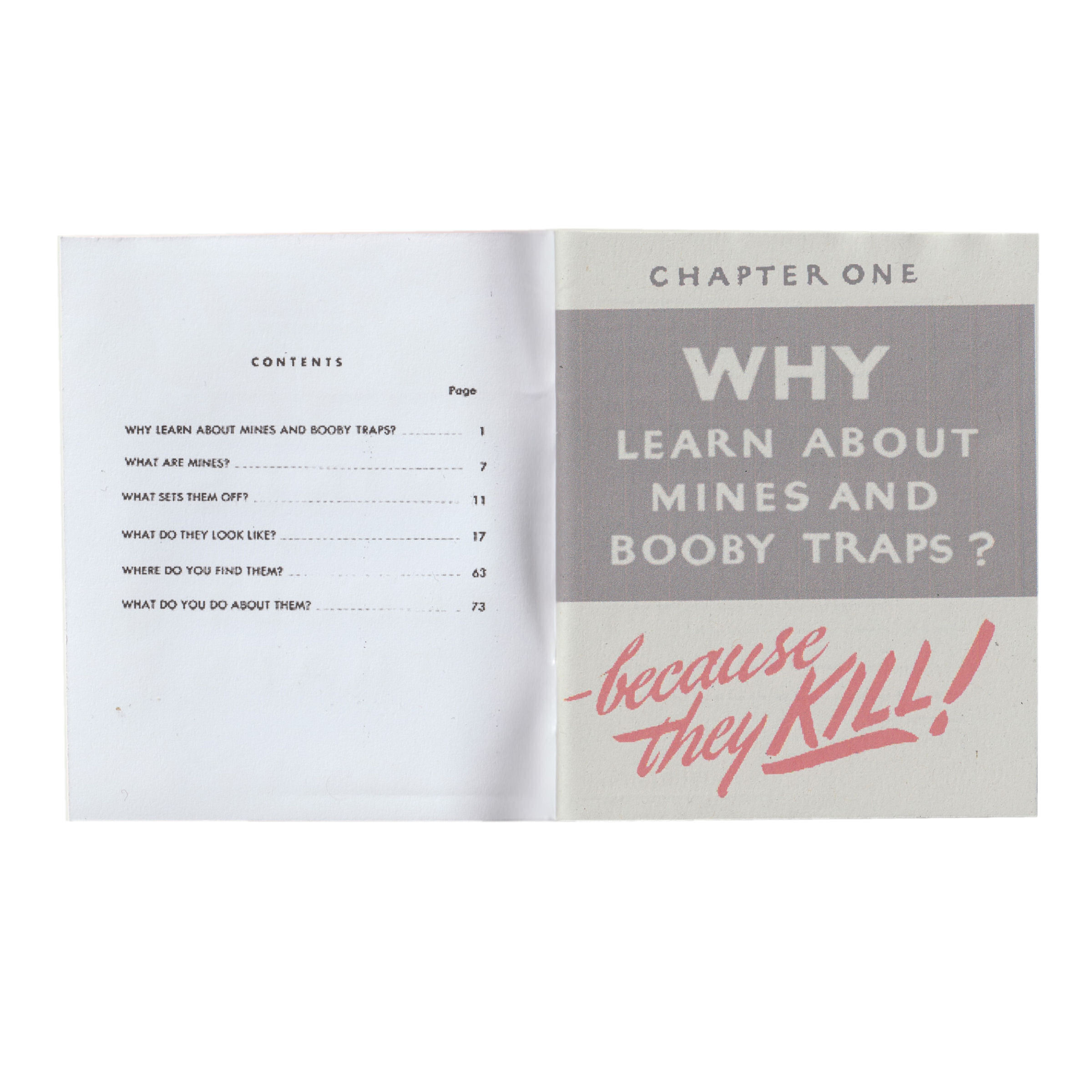 A replica of an instructional booklet on mines and booby traps. Pocket-sized. A copy of the 1944 edition published for the U.S. Armed Forces. A practical guide to recognizing and avoiding the threats posed by German and Japanese mines and improvised booby traps. The booklet consists of descriptions and situational and technical drawings. The replica is made on gray paper giving it an aged look.
