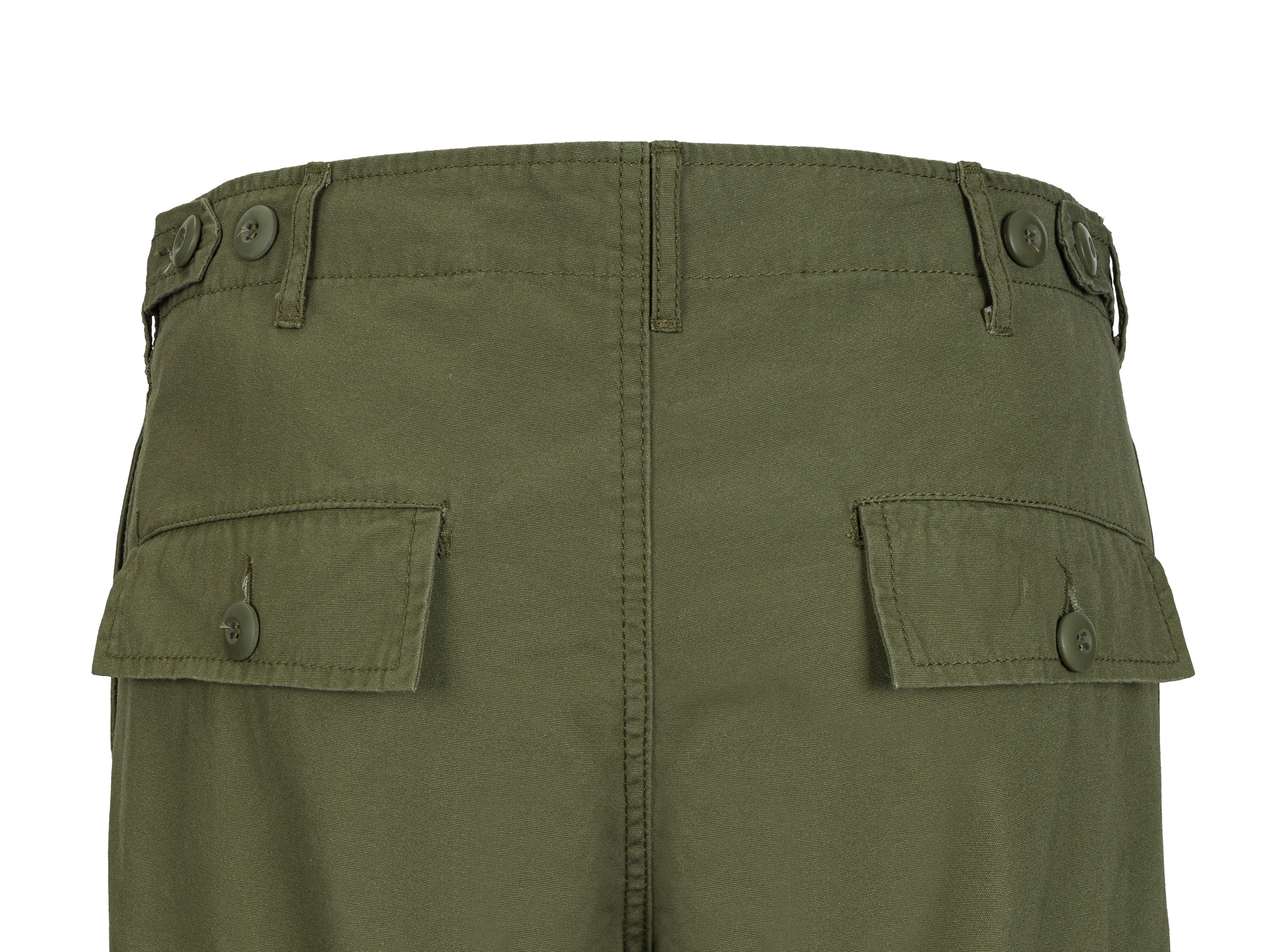 A replica of the TCU "Tropical Combat Uniform" trousers, commonly known as "jungle fatigues." This replica represents the first pattern of the uniform, approved in 1963. The trousers are made of cotton poplin fabric in the OG-107 color scheme. The trousers feature two large cargo pockets at thigh height and two smaller internal pockets on the buttocks, all buttoned. Additionally, there are standard open pockets on the hips. A distinctive feature of the TCU 1st pattern uniform are exposed buttonholes on the pockets (not covered by a flap).