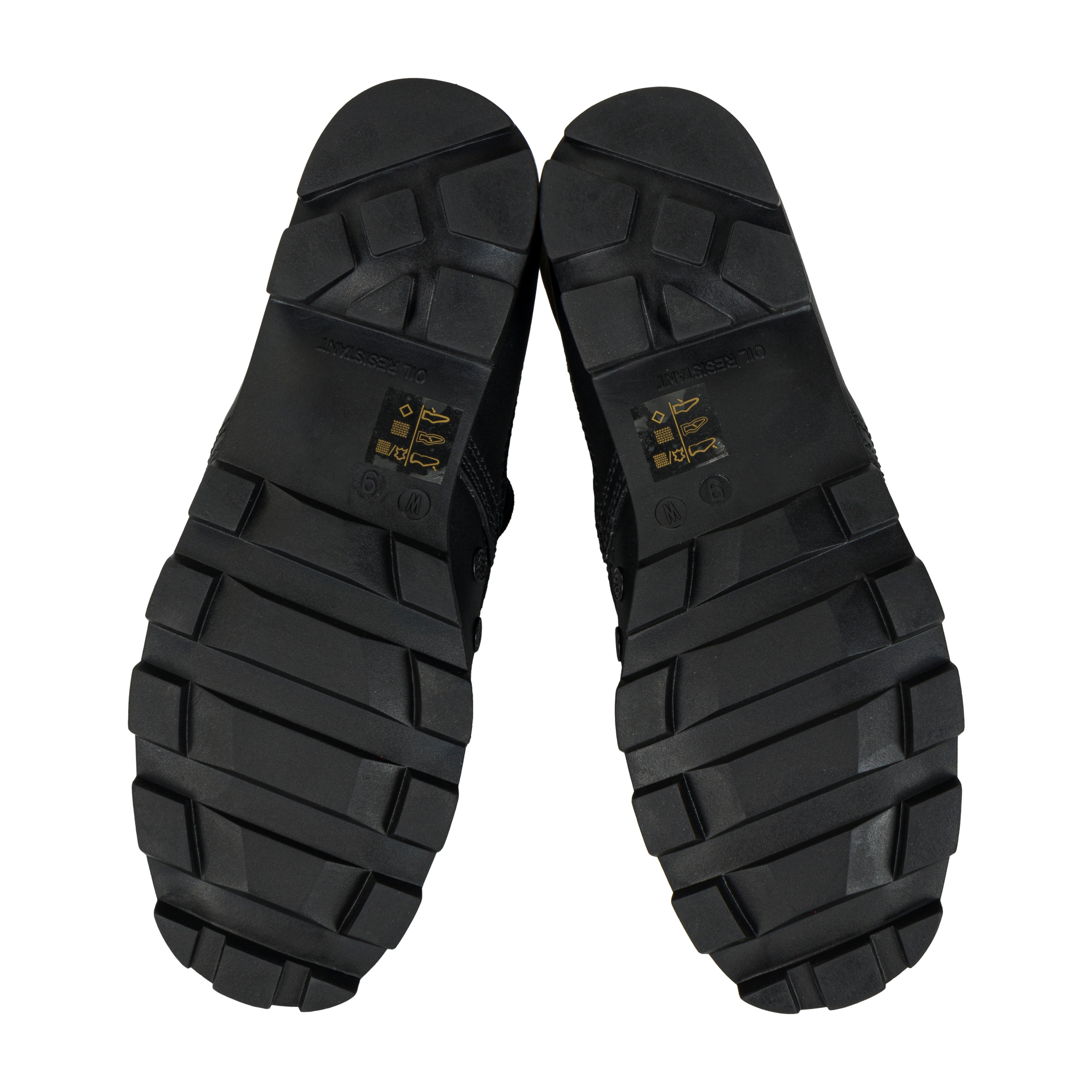 A replica of the American M-1966 tropical boots, the so-called "Jungle Boots", in a version with a Panama sole. The shoes have a rubber sole with a distinctive tread pattern of straight, angled grooves (this tread pattern pushes soft mud out of the sole, providing better traction on sticky clay or mud). The sole is glued to the upper of the shoe, which is made of black patent leather at the base. The tongue and shaft, sewn to the lower leather section, are made of nylon fabric. The shoes have leather reinforcement in the area of the lacing holes and two drainage holes (allowing water to drain from the inside of the shoe) in the lower part.