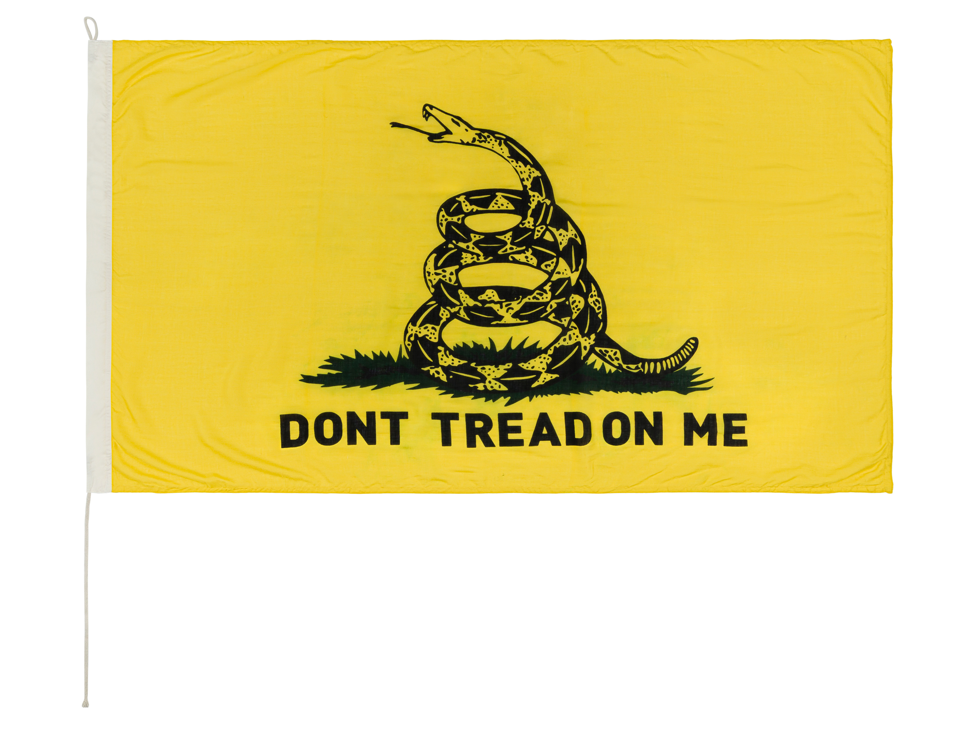 A replica of the historic Revolutionary War American flag, which depicts a common rattlesnake curled up against a yellow background, ready to attack. Under the snake there is an inscription reading DON'T TREAD ON ME. The flag was designed by American general and politician Christopher Gadsden. It was used by the Continental Marines during the American Revolutionary War. Made of thin cotton fabric.