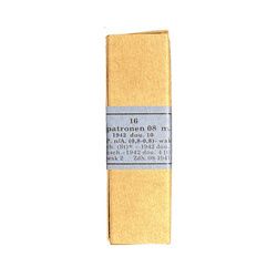A high quality replica of the Pistolenpatronen 08 pistol ammunition packaging from 1942. Replica made of cardboard and with appropriate markings. The front part of the label is not glued, so the carton can be opened. A version of the packaging for ammunition produced in Czechoslovakia (the T mark is an abbreviation for tschechoslowakisch production). Inside there is a cartridge separator. The packaging contain space for 16 pieces of 9mm Luger ammunition for P08/P38 and Maschinenpistolen MP38/MP40 pistols and many others.