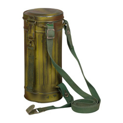 Replika stalowej puszki Luftwaffe na maskę przeciwgazową , wraz z paskami. Puszka w kolorze Blaugrau - niepostarzona