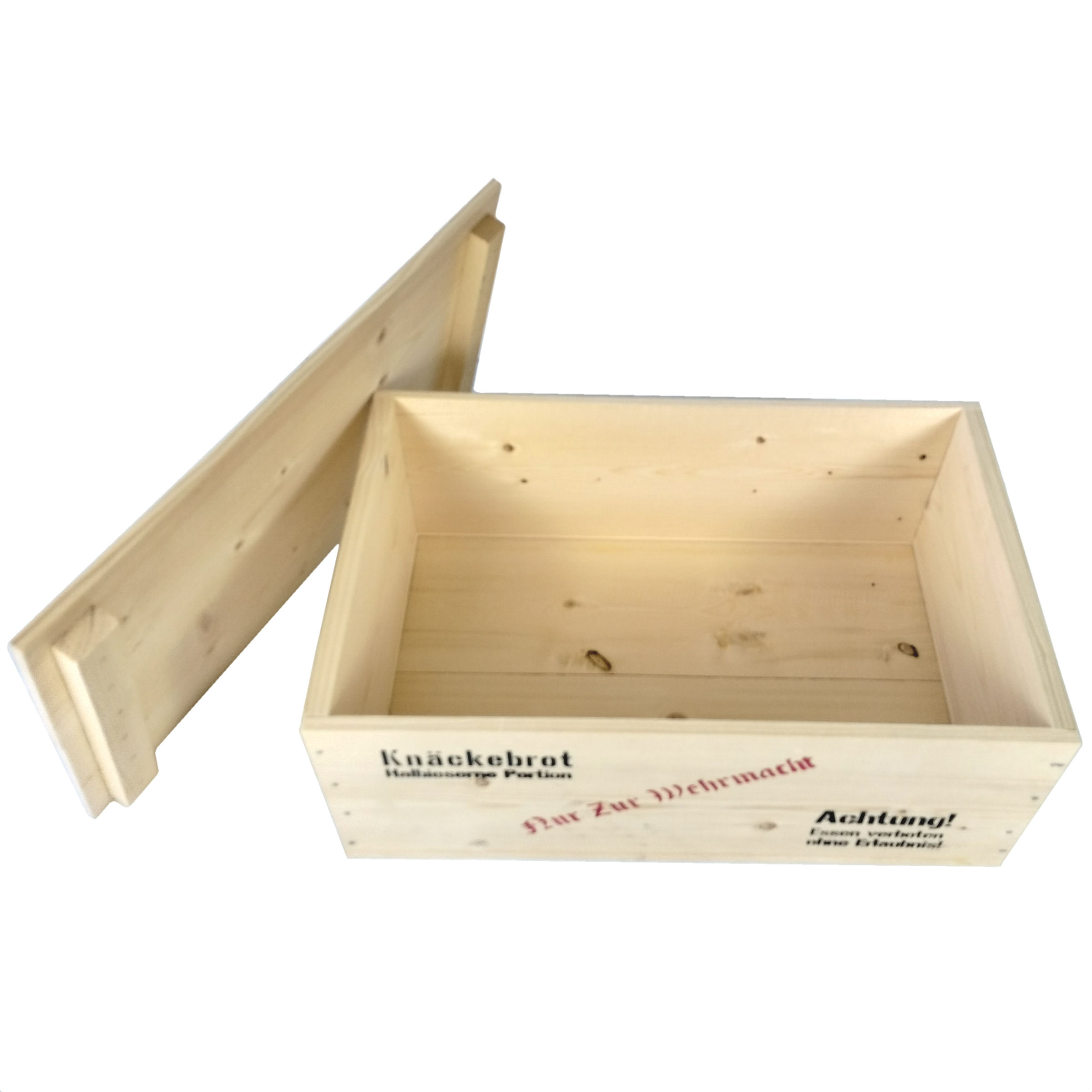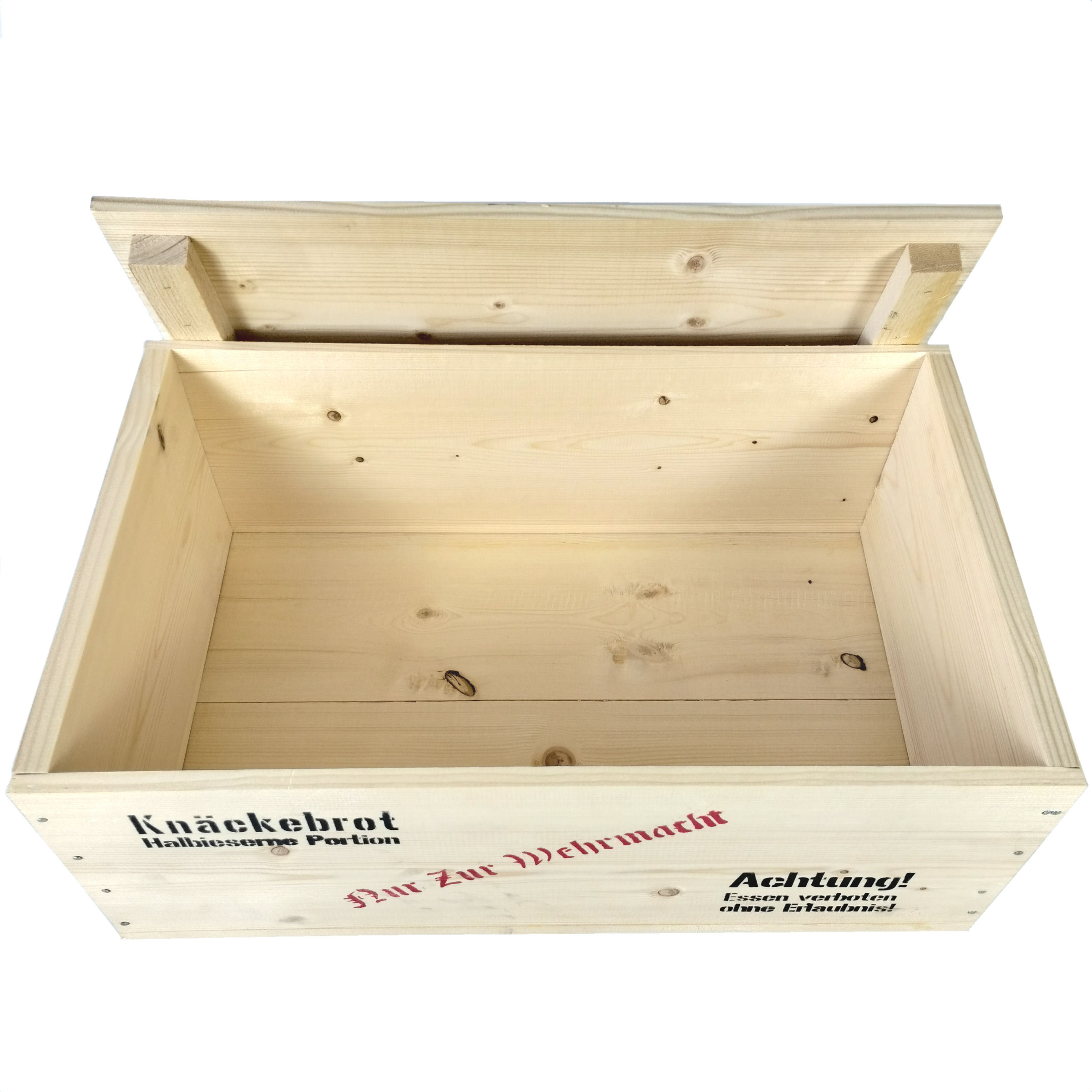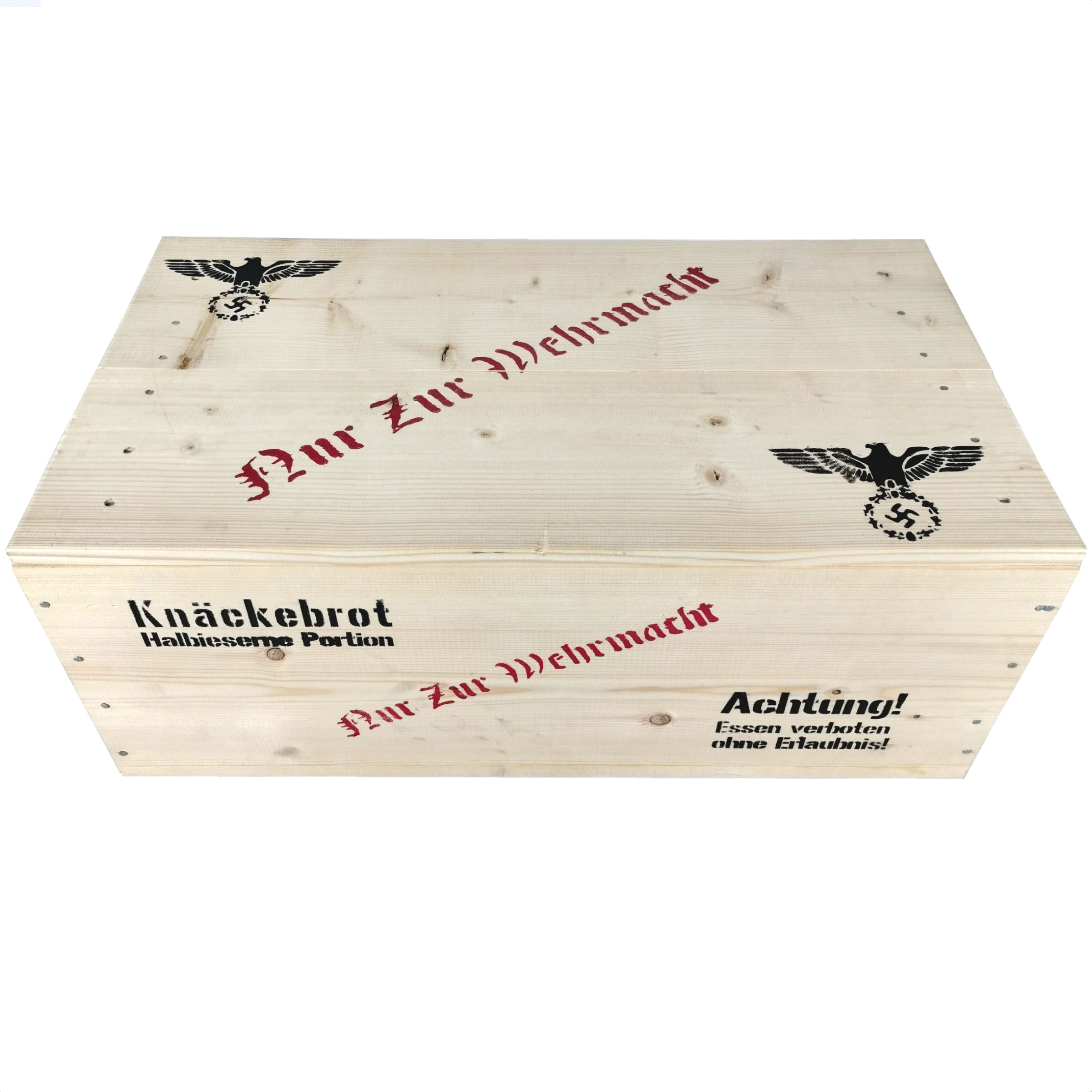Piękna replika drewnianej skrzynki zaopatrzeniowej do przewożenia racji z pieczywem. Wymiary jak i kształt zgodne z okresem historycznym. W środku mieściło się 100 sztuk 60 gramowych porcji pieczywa chrupkiego. Dla zapewnienia jak najdłuższego okresu użytkowania, zalecane jest zakonserwowanie drewna. Deski mogą posiadać niedoskonałości, pęknięcia, być nie równo zbite i nie być w pełni oszlifowane (zgodnie jak z oryginałami). Idealnie się nada do uzupełnienia ekspozycji czy dioramy.