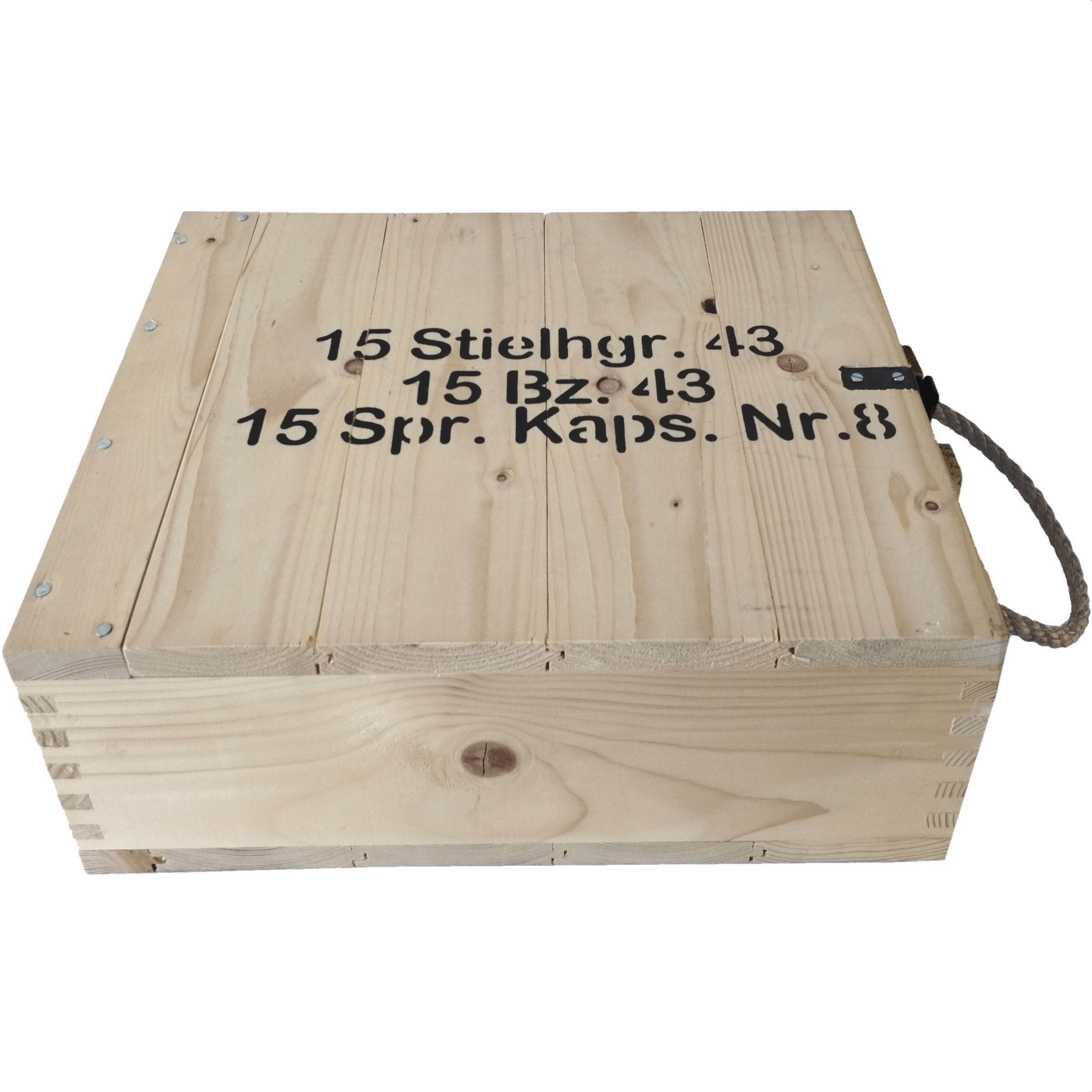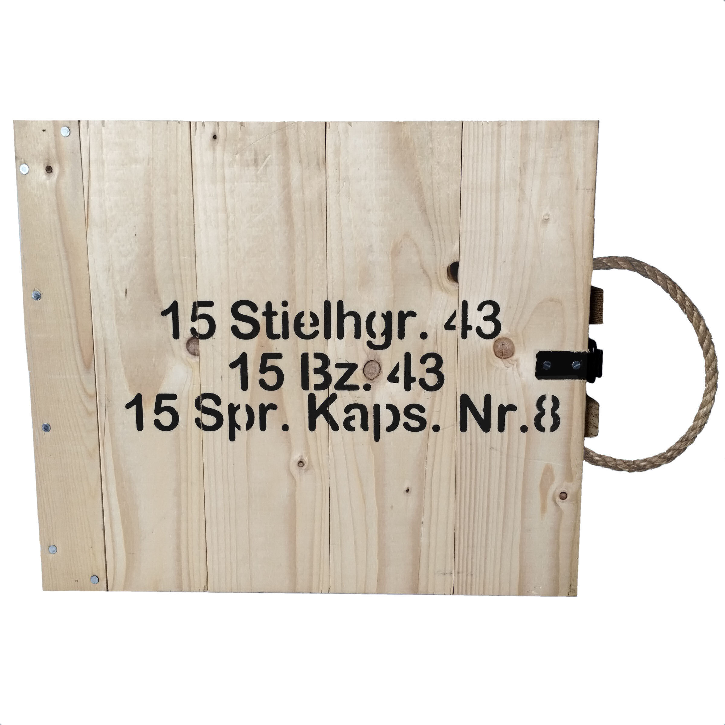 Piękna replika drewnianej skrzynki zaopatrzeniowej do przewożenia granatów Stiehlhgranade M43. Wymiary, kształt jak i oznaczenia zgodne z okresem historycznym. W środku komora dostosowana na 15 granatów trzonkowych M43/M24 (UWAGA, granaty M43 z aktualnej partii, mieszczą się w skrzyni po wykręceniu imitacji zapalnika). Dla zapewnienia jak najdłuższego okresu użytkowania, zalecane jest zakonserwowanie drewna. Deski mogą posiadać niedoskonałości, pęknięcia, być nie równo zbite i nie być w pełni oszlifowane (zgodnie jak z oryginałami). Idealnie się nada do uzupełnienia ekspozycji czy dioramy.