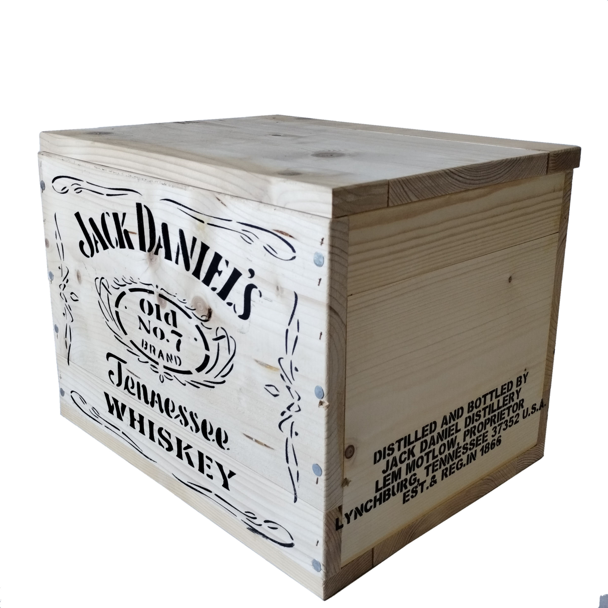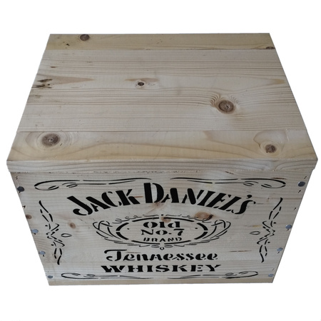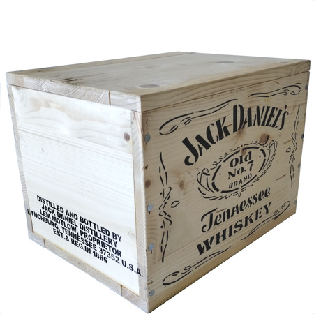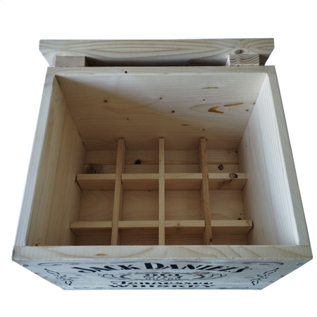 Piękna replika drewnianej skrzynki zaopatrzeniowej do przewożenia Whiskey. Wymiary, kształt jak i oznaczenia zgodne z okresem historycznym. W środku demontowalne drewniane przegródki na 12 butelek. Dla zapewnienia jak najdłuższego okresu użytkowania, zalecane jest zakonserwowanie drewna. Deski mogą posiadać niedoskonałości, pęknięcia, być nie równo zbite i nie być w pełni oszlifowane (zgodnie jak z oryginałami). Idealnie się nada do uzupełnienia ekspozycji czy dioramy.