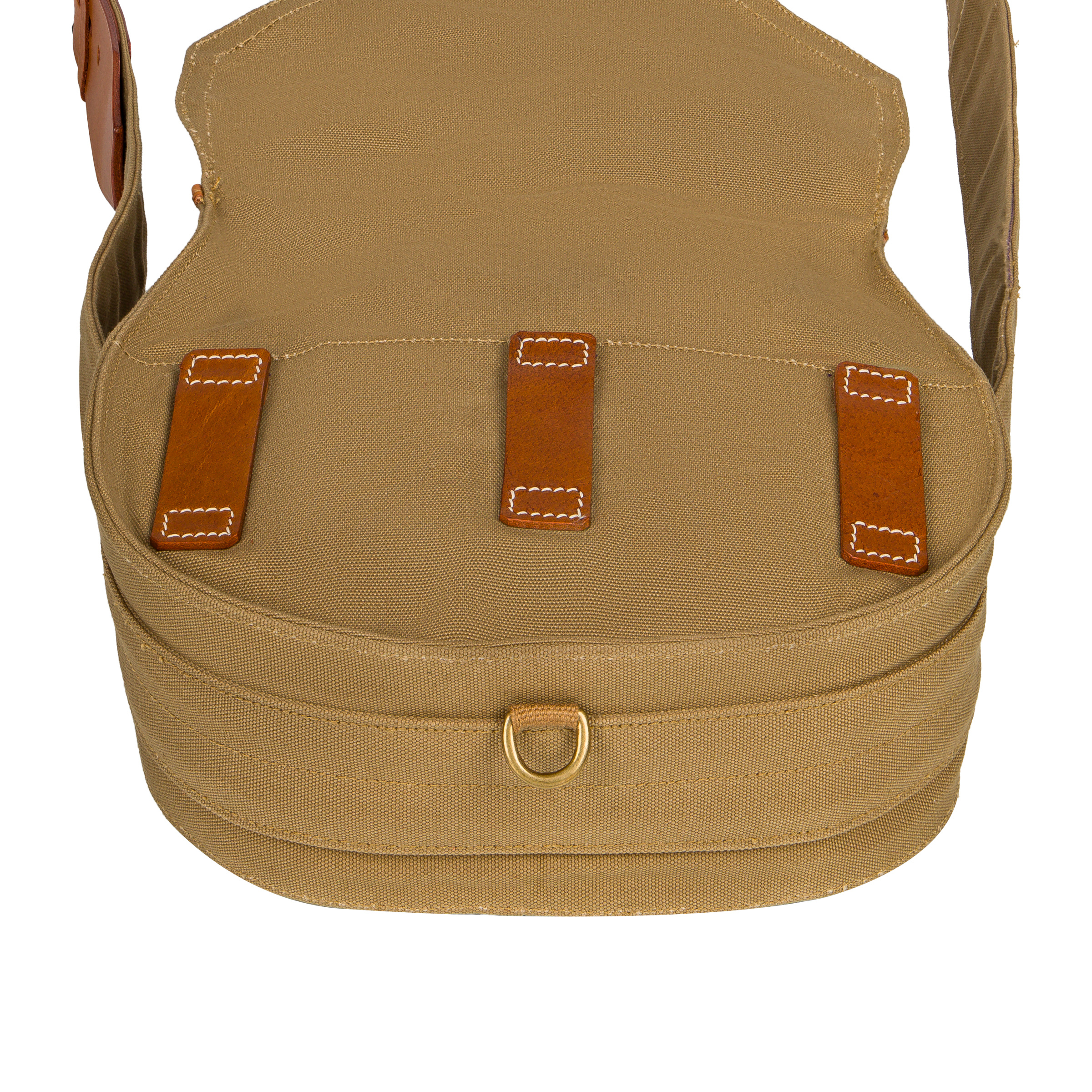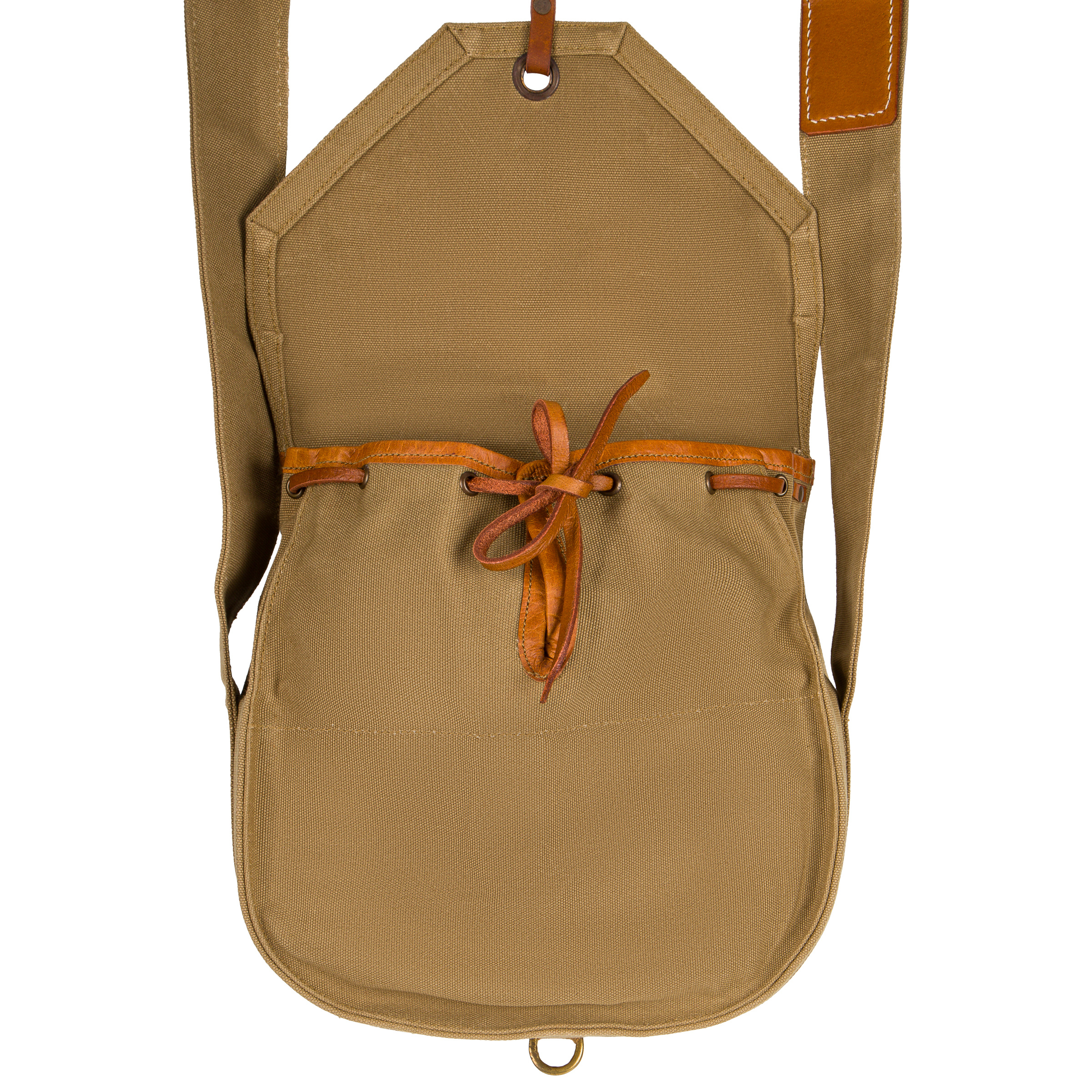 Wierna replika francuskiej torby/bandoliera na magazynki do karabinu Chauchat. Torba wykonana z bawełnianej tkaniny w kolorze beżowym. Zamykana jednoczęściową klapą za pomocą skórzanego paska, który wiąże się do mosiężnego D-Ringa umieszczonego na spodzie torby. Na tylnej ściance torby naszyte są trzy skórzane szlufki, które służą do mocowania torby do pasa głównego. Do podtrzymywania służy zaś płócienno-skórzany pasek szerokości 5 cm, przeszytym w wokół głównej komory torby.