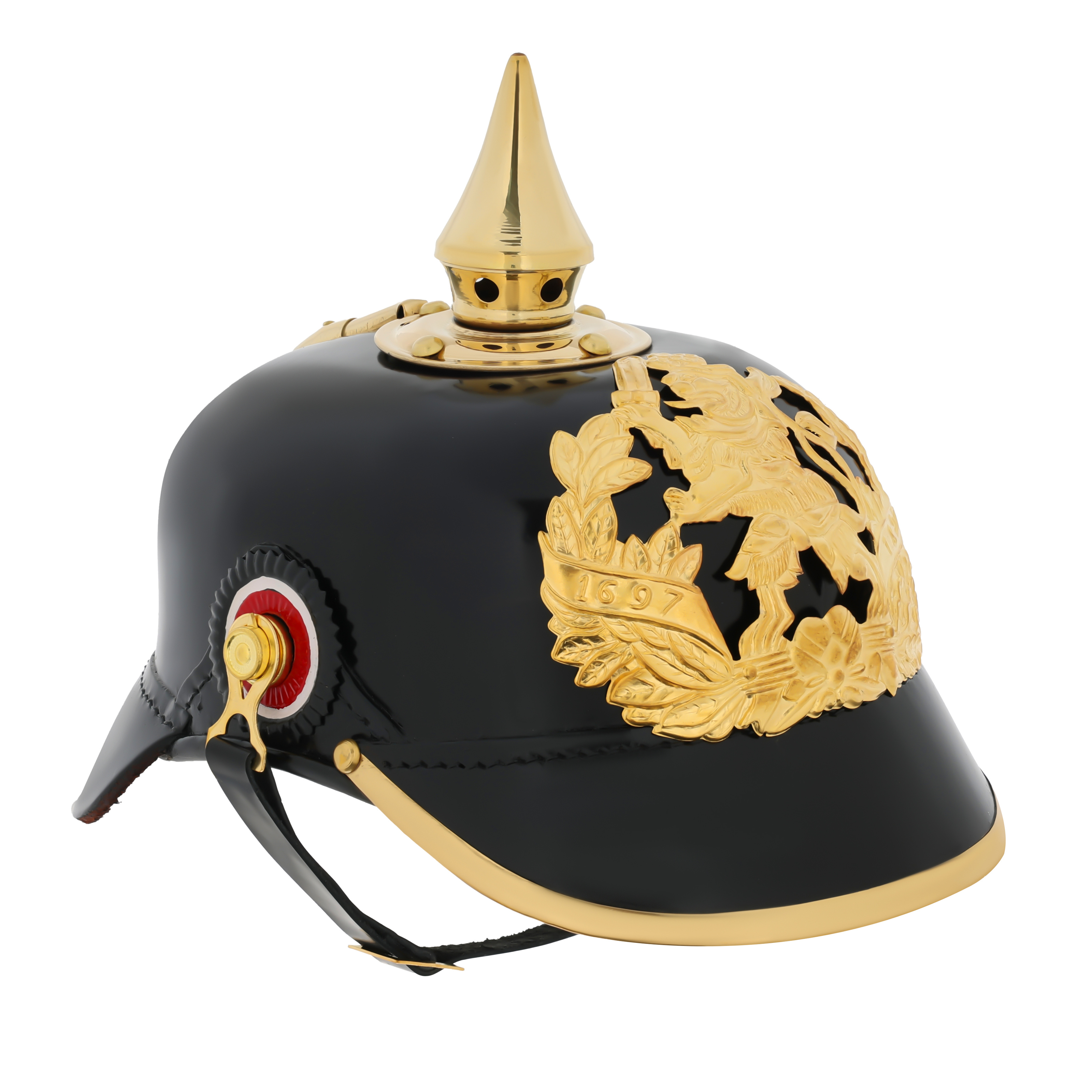 Przedmiotem oferty jest doskonała replika Pickelhaube M1895 w wersji z herbem Wielkiego Księstwa Hesji. Pickelhauba w rozmiarze uniwersalny, posiada wkład i podpinkę skórzaną. Po bokach znajdują się rozety. Jedna w barwach narodowych Cesarstwa Niemieckiego, druga w barwach państwa związkowego. Replika wykonana jest z naturalnej lakierowanej skóry metodą tłoczenia, insygnia mosiężne.