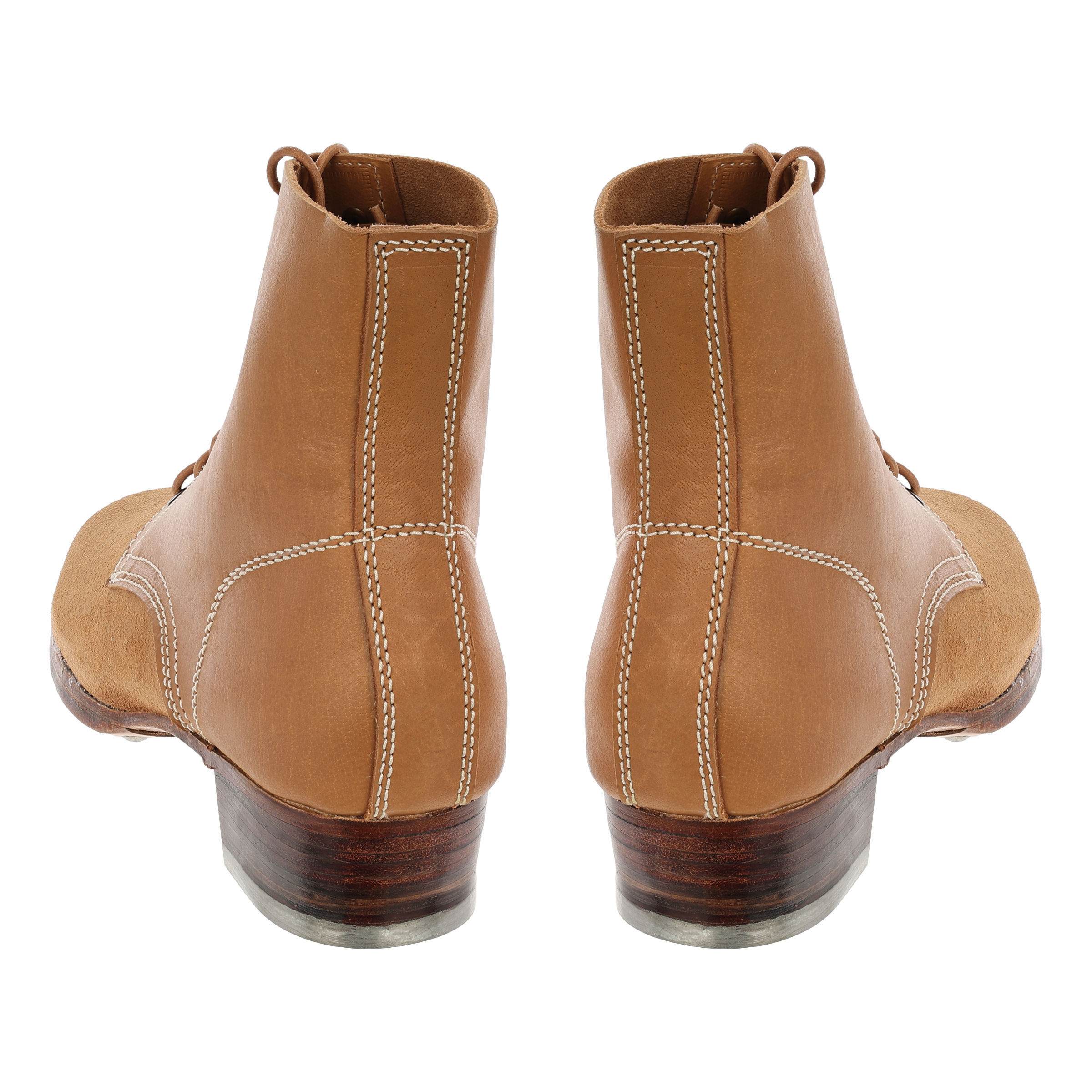 Replika trzewików niemieckich Schnurschuhe M43, wykonanych z naturalnej skóry. Buty podkute metalowymi gwoździami. Podeszwa jest kołkowana i przeszywana nicią. Obcas podkuty podkówką - współcześnie wykonaną repliką. Buty sprzedawane są w naturalnym kolorze skóry - zgodnie z realiami epoki, kiedy to żołnierz musiał czernić i konserwować je własnoręcznie. Prosimy o zwrócenie uwagi - z racji użycia wyłącznie naturalnych surowców buty mogą delikatnie różnić się odcieniem od przedstawionych na zdjęciu, mieć drobne niedoskonałości skóry. Jest to normalne zjawisko przy użyciu każdego naturalnego surowca.