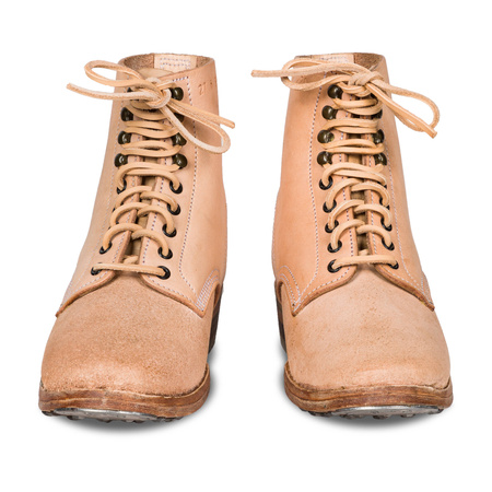 Buty sprzedawane są w naturalnym kolorze skóry - zgodnie z realiami epoki, kiedy to żołnierz musiał czernić i konserwować je własnoręcznie. Prosimy o zwrócenie uwagi - z racji użycia wyłącznie naturalnych surowców buty mogą delikatnie różnić się odcieniem od przedstawionych na zdjęciu, mieć drobne niedoskonałości skóry. Jest to normalne zjawisko przy użyciu każdego naturalnego surowca.