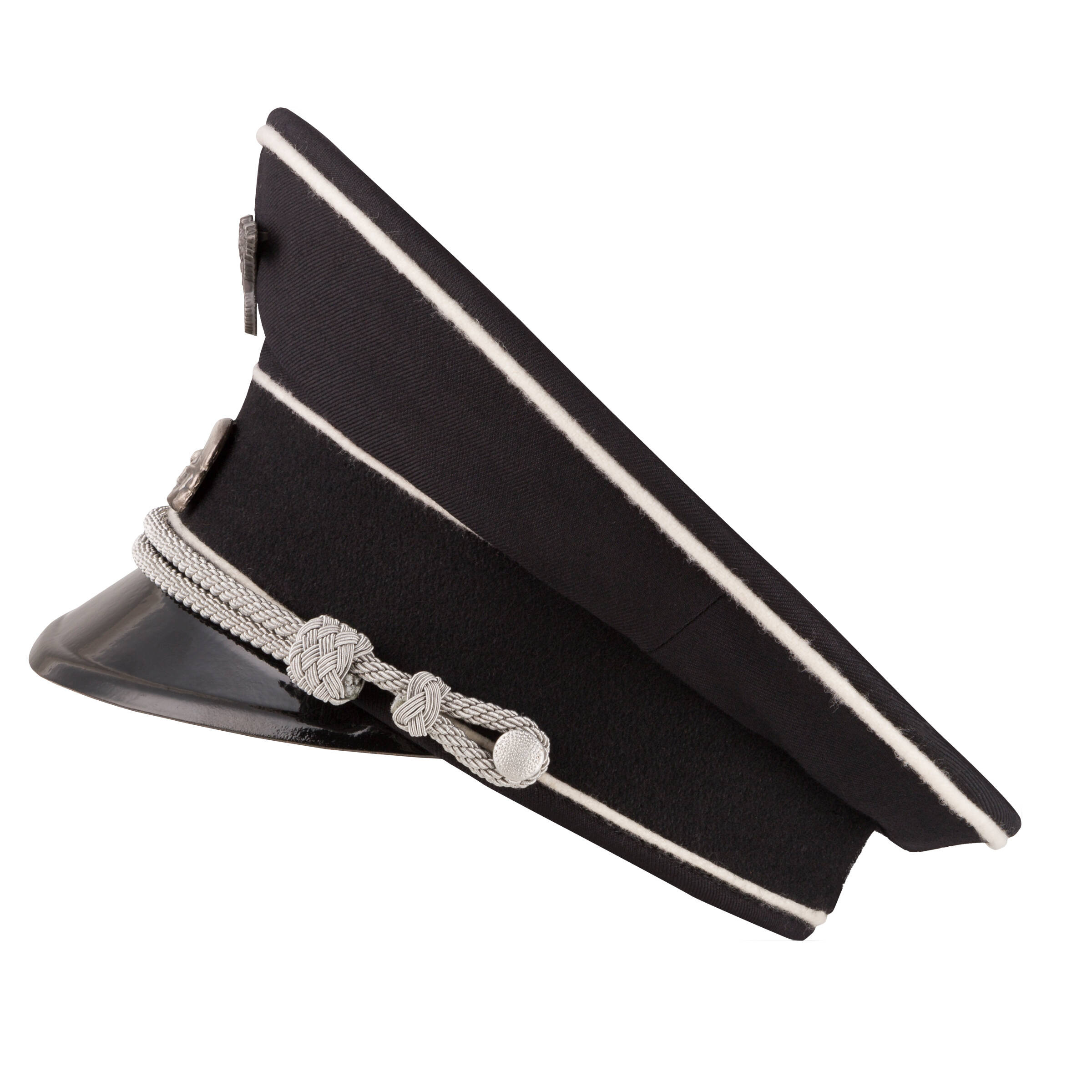 Replika czapki Allgemeine-SS. Czapka wykonana jest z czarnej gabardyny z białym otokiem, natomiast potnik zrobiony jest ze skóry w kolorze kremowym. Daszek czarny, lakierowany. Czapka posiada sznur wykonany ze srebrnego bajorka, mocowany na srebrne guziki groszkowane. Czapka posiada metalowe, postarzane insygnia - adler oraz czaszka.