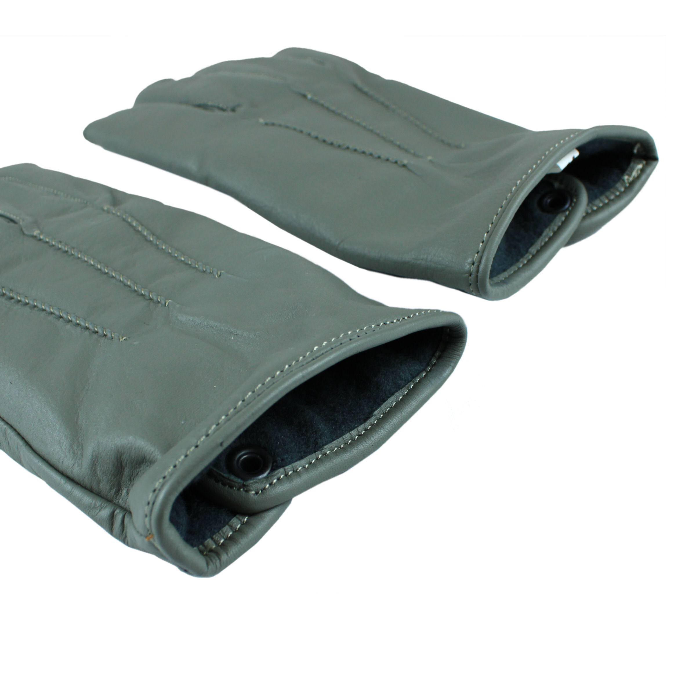 Replika zimowych rękawiczek polowych. Wykonane z naturalnej licowej skóry w kolorze szarym. Wewnątrz dla komfortu cieplnego zastosowano flausz wełniany. Na zewnętrznej stronie rękawiczek są trzy przeszycia, zaś odcinek na nadgarstku jest zapinany napą.