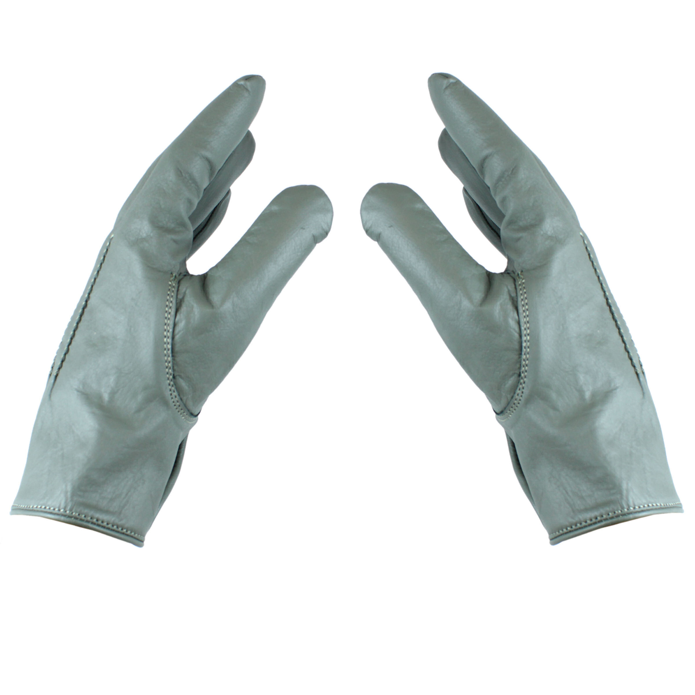 Replika zimowych rękawiczek polowych. Wykonane z naturalnej licowej skóry w kolorze szarym. Wewnątrz dla komfortu cieplnego zastosowano flausz wełniany. Na zewnętrznej stronie rękawiczek są trzy przeszycia, zaś odcinek na nadgarstku jest zapinany napą.