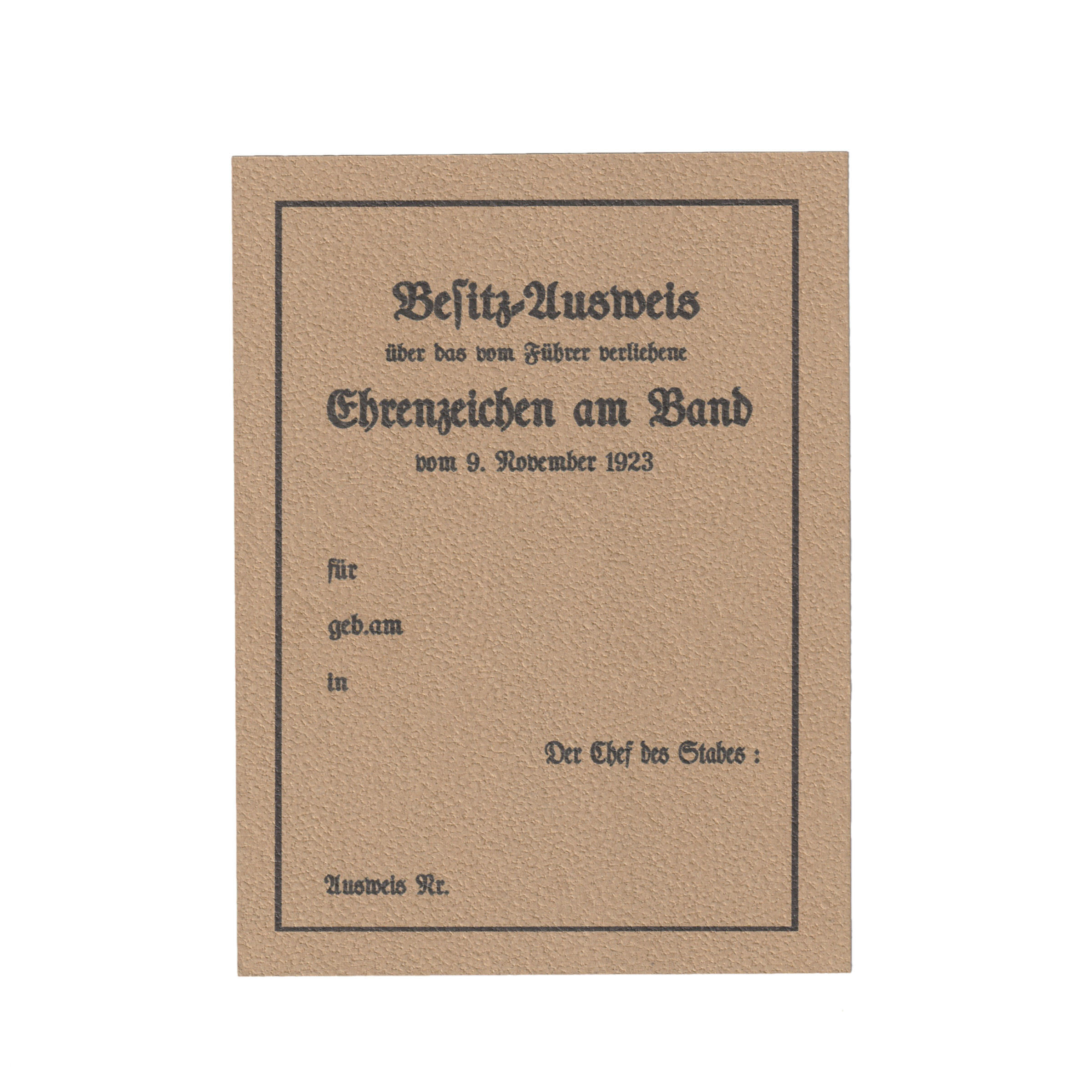 Doskonała replika legitymacji posiadacza Orderu Krwi. Order został ustanowiony w 1934 roku przez Adolfa Hitlera. Początkowo przyznawano go tylko uczestnikom puczu monachijskiego z 1923, później zakres ten rozszerzono. Ausweis jest wykonany na solidnym papierze, niewypełniony. Bardzo wiernie odwzorowane szczegóły.