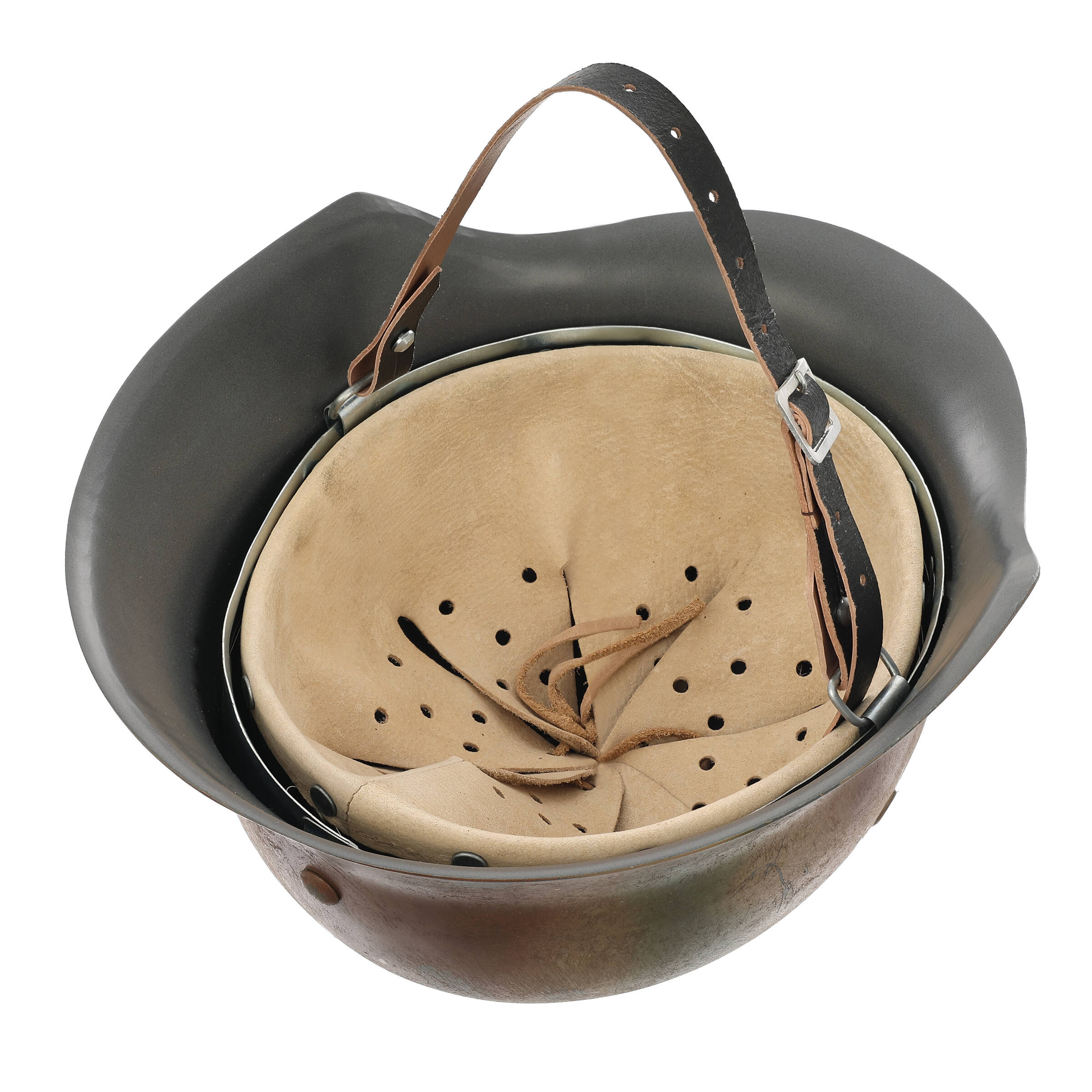 Wierna replika hełmu niemieckiego, wzoru M42, wykonanego ze stali. Hełm jest w malowaniu tzw. normandzkim - farba piaskowa zmieszana z zieloną. W zestawie skórzana podpinka oraz wyposażenie wewnętrzne. Hełm posiada kalkomanie Waffen SS. Wersja mocno postarzona - hełm posiada ubytki w farbie lub zarysowania, wgniecenia, niewielkie ubytki w farbie. Wiernie odtworzone szczegóły.