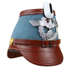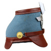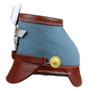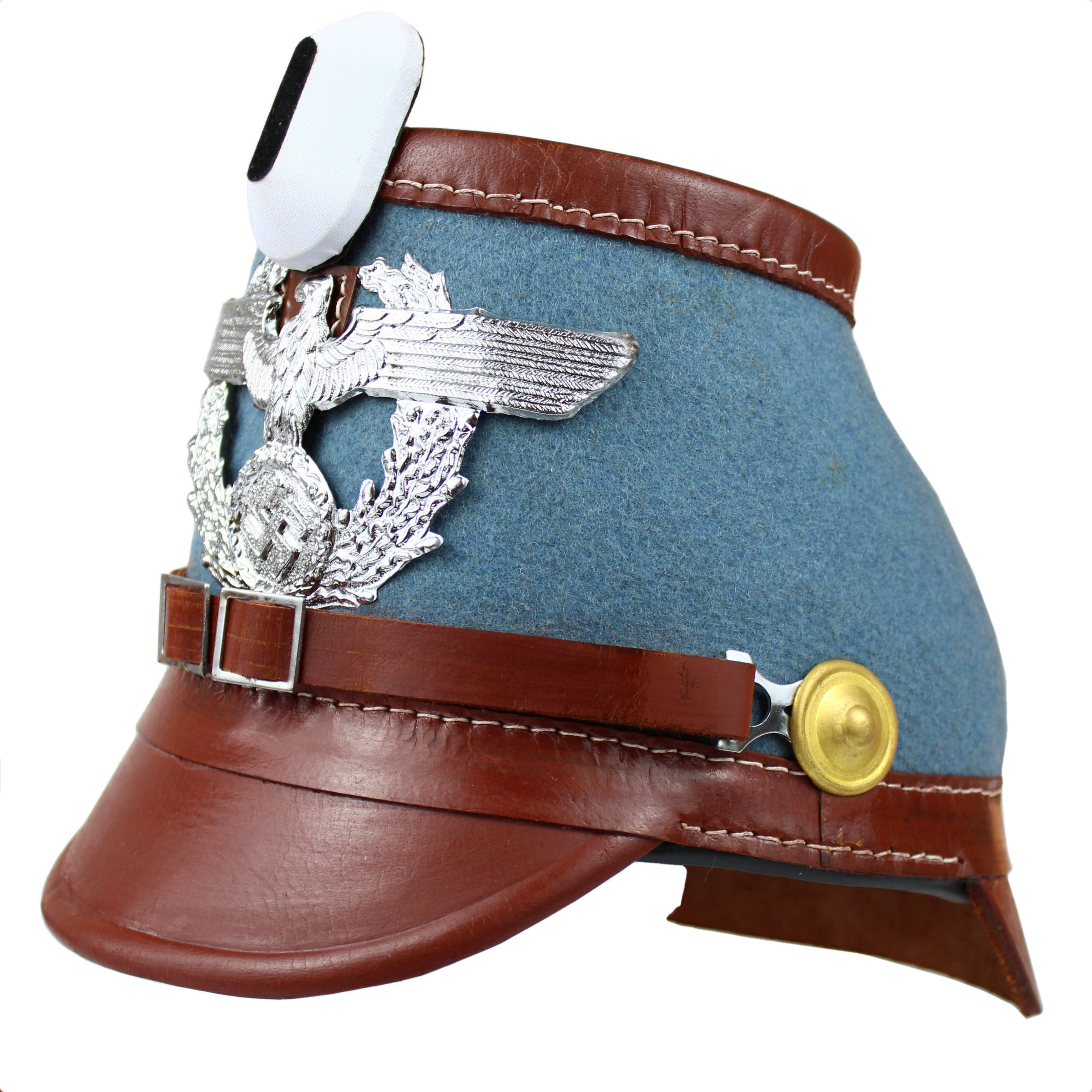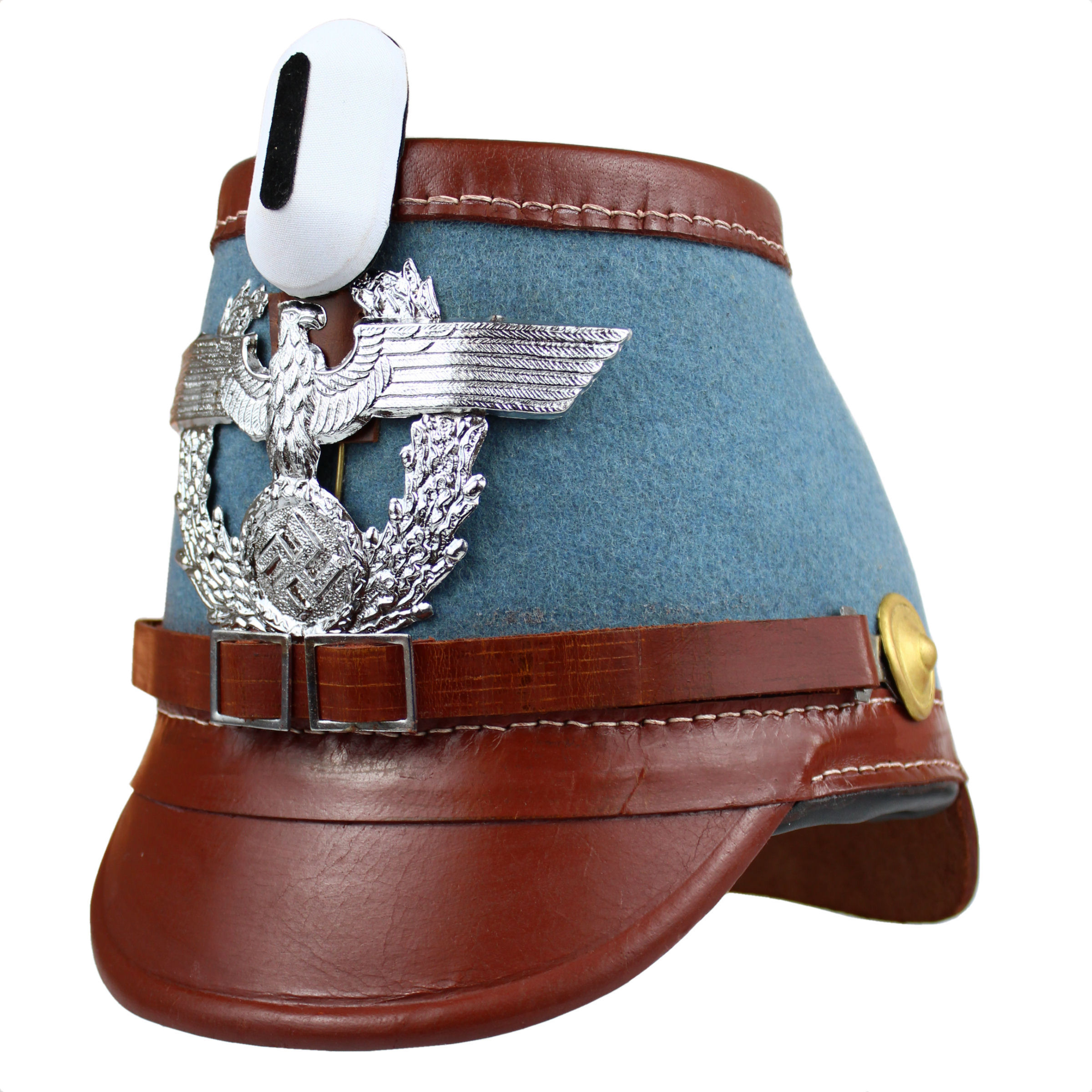 Replika niemieckiego czako policyjnego - Żandarmerii. Replika wykonana jest z naturalnej skóry metodą tłoczenia, okucia i insygnia są metalowe. Skóra jest barwiona na kolor brązowy (nie jest lakierowana). Czapka jest obita tkaniną w barwie jasnoniebieskiej. Na froncie znajduje się metalowy Adler wzoru formacji policyjnych.