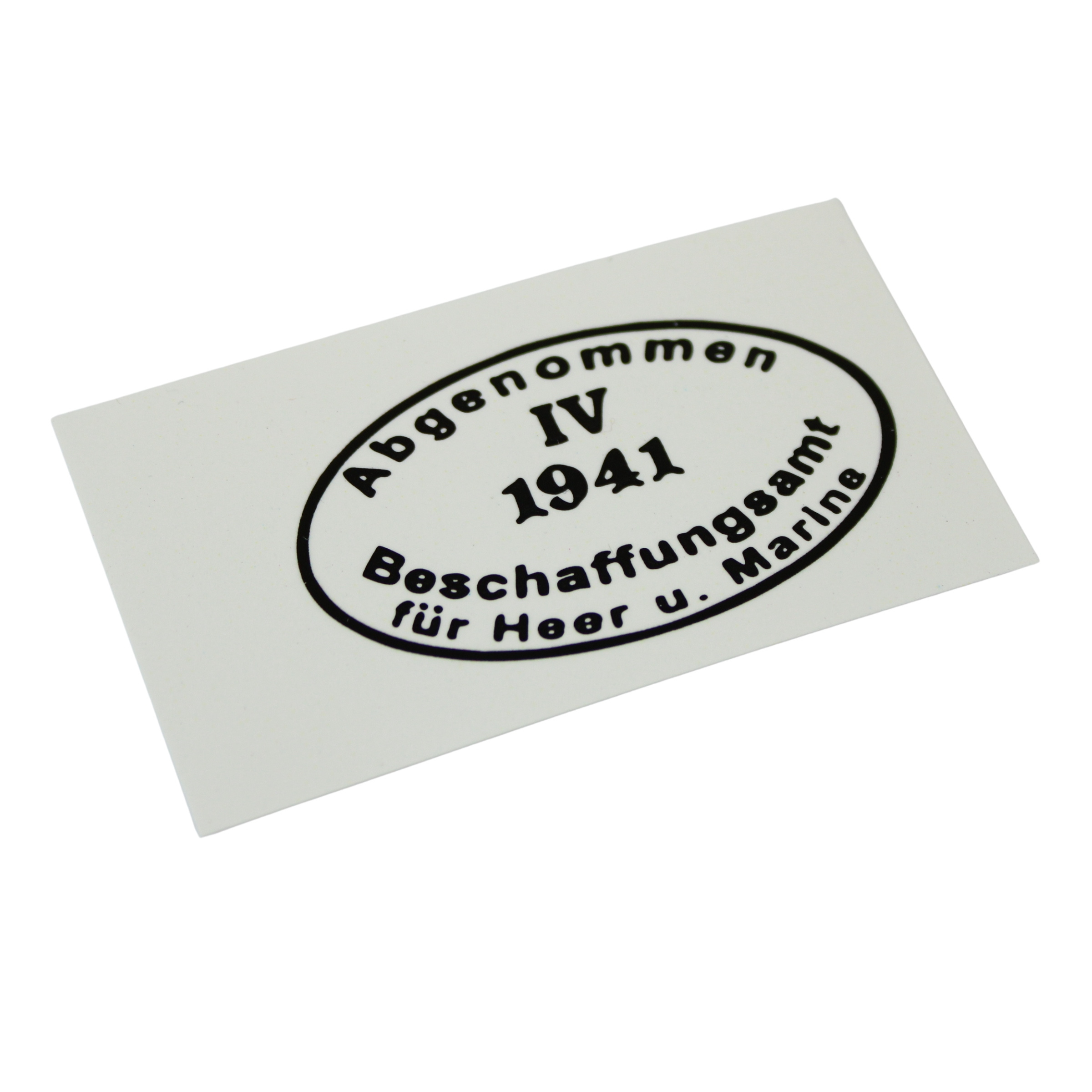 Przedmiotem oferty jest kalkomania na hełmy niemieckie, będąca imitacją datowanego stempla odbioru hełmu dla wojska. Jest to typowa kalkomania wodna. Polecana zarówno do replik jak i renowacji hełmów. Podnosi walory wizualne hełmu, upodabniając je do oryginałów z czasów swej świetności.